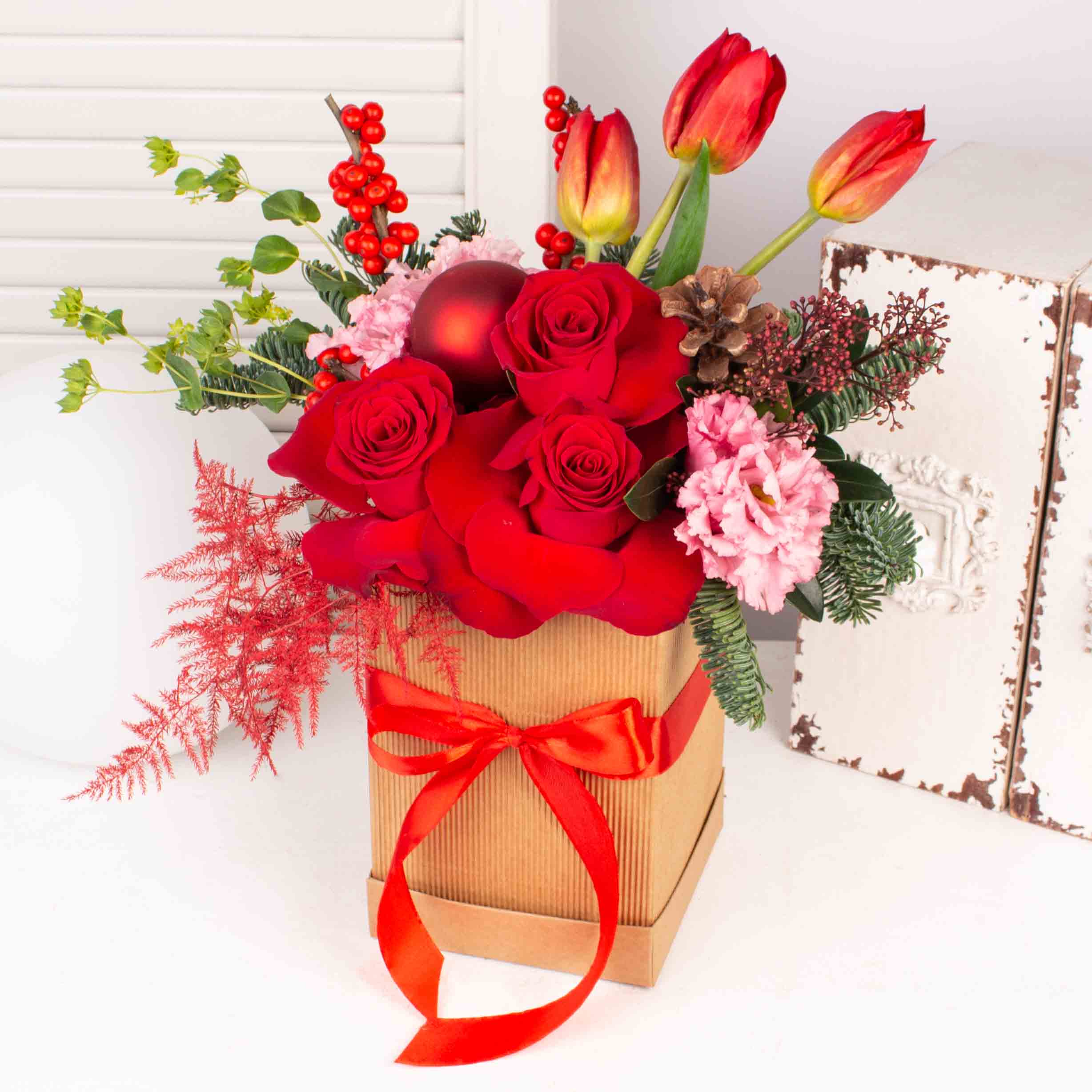 Aranjament in cutie cu glob mare rosu, 3 trandafiri rosii, ilex rosu, 3 lalele rosii, asparagus rosu, verdeata si alte flori de decor.