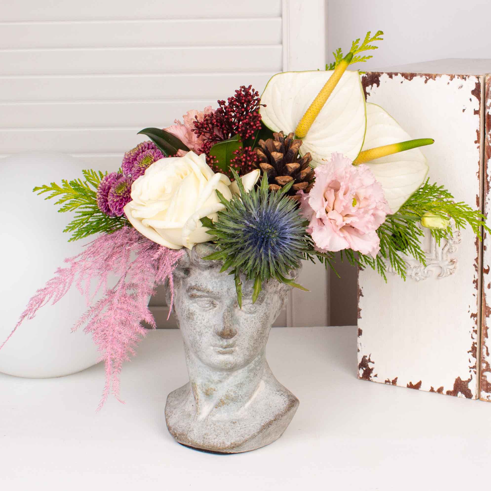 Aranjament in vaza antichizata cu trandafir alb, crizantema santini roz, 2 anthurium alb, lisianthus roz, verdeata si alte flori de decor.