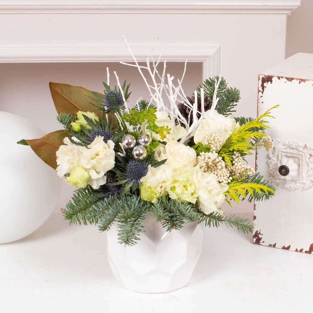 Aranjament de Craciun cu lisianthus, trandafiri si alte flori