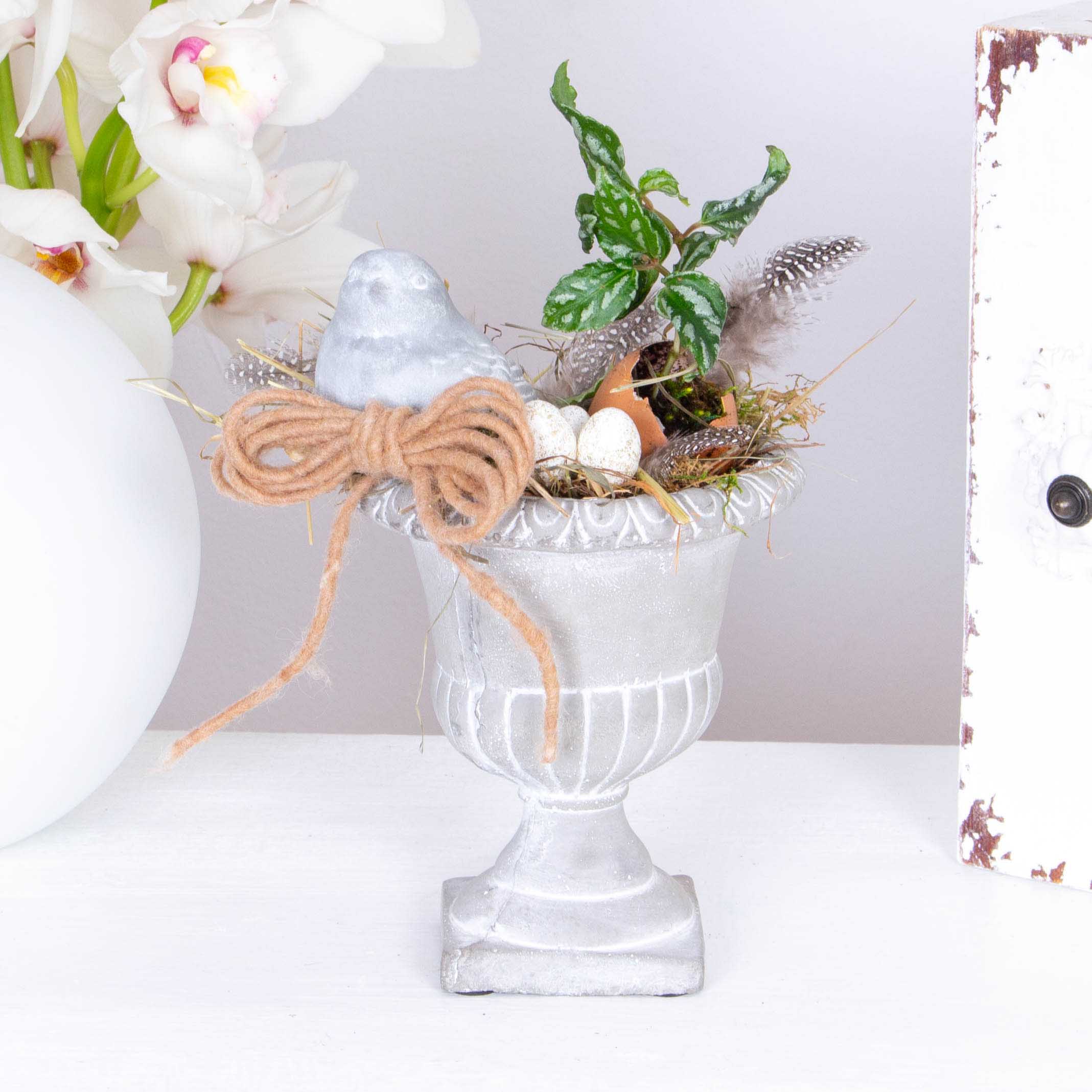 Aranjament in vas ceramic cu pasare ciment, planta pilea, funda si alte elemente de decor.