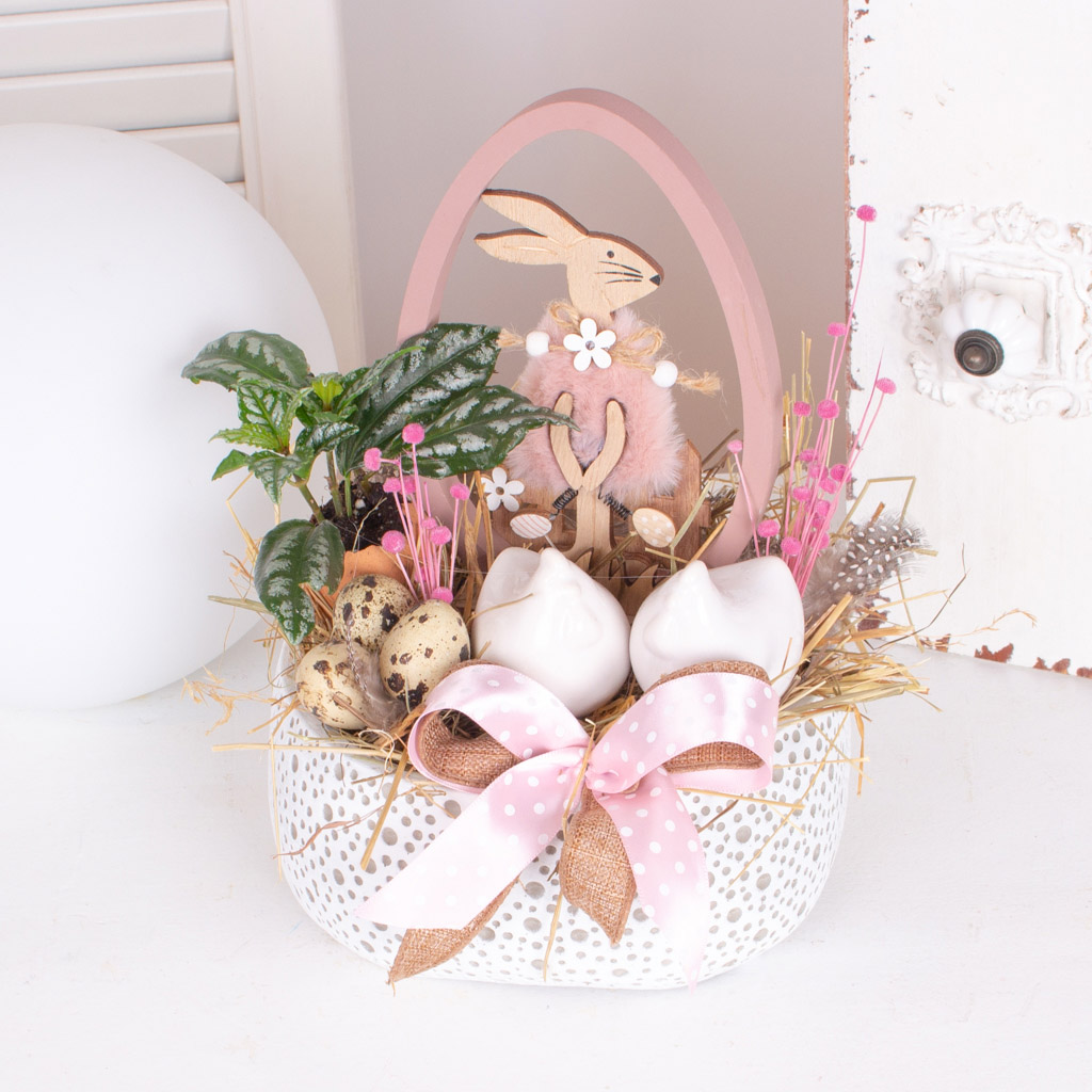 Sarbatorile sunt pentru noi si pentru cei mai apropiati sufletelor noastre. Acest aranjament care consta in vas buline figurina iepuras, figurina gainusa, oua si planta precum si celelalte aranjamentele de Paste cu iepurasi, gainuse, oua, ciupercute si gargarite vor fi in centrul atentiei oriunde le vei aseza. V-am pregatit aranjamente cu oua rosii, aranjamente cu decoratiuni cosuri cu iepurasi si plantute, cosuri cu bunatati si cosuri pentru oua pentru sarbatoarea de Paste. Aceste aranjamente va vor bine dispune la birou in timp ce lucrati sau acasa in timp ce pregatiti cozonacii si vor decora frumos masa de Paste. Un aranjament de Paste este cel mai frumos cadou pentru prieteni si familie.