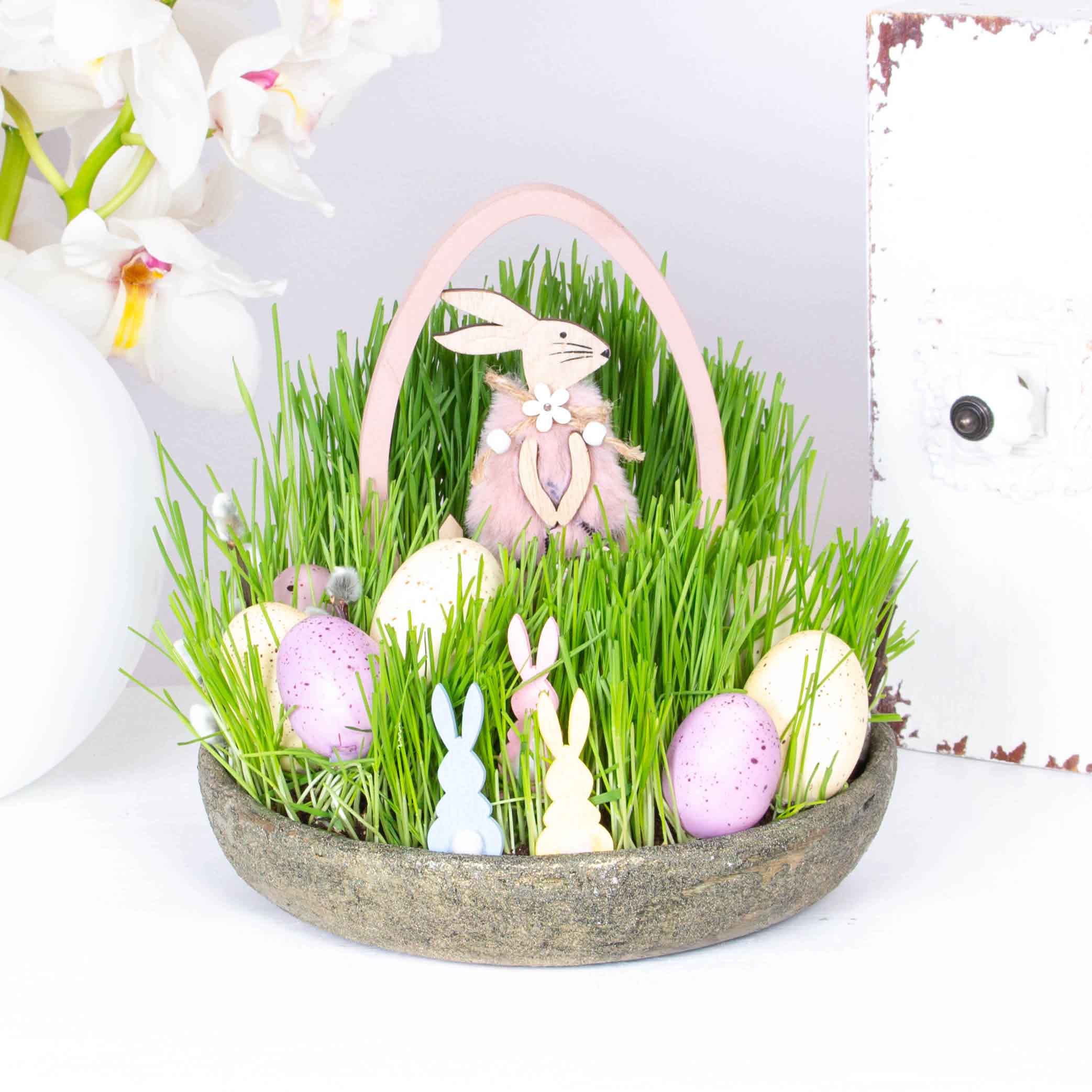 Aranjament in vas ceramic cu figurina medie iepuras roz, 3 figurine mici iepurasi de lemn, grau incoltit si alte elemente de decor.