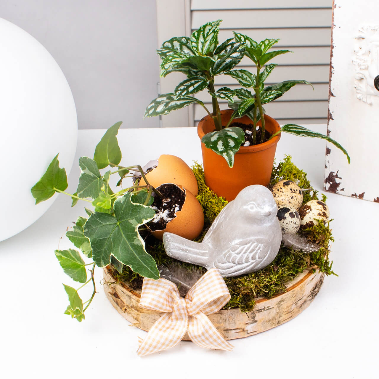 Aranjament pe felie de lemn cu pasare de ciment, ghiveci cu planta pilea, iedera si alte elemente de decor.
