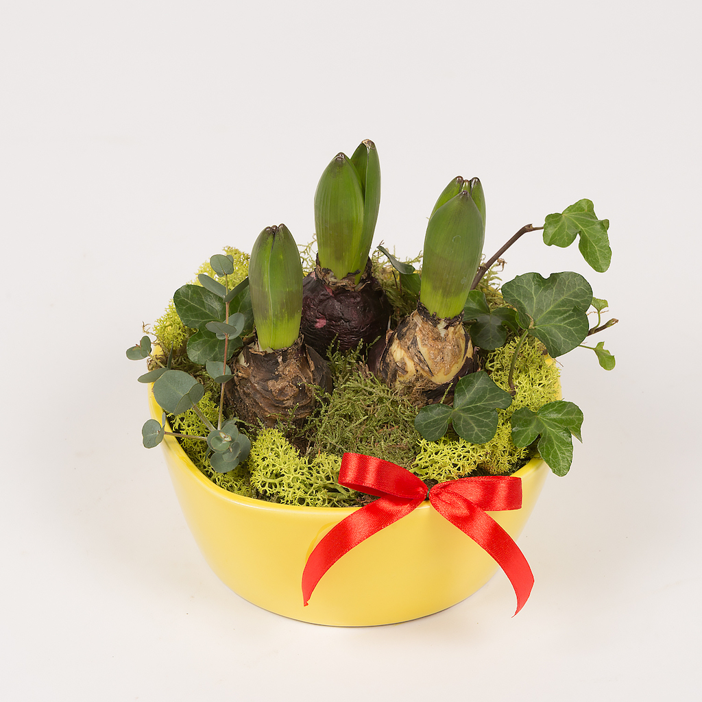Aranjament in vas ceramic cu 3 bulbi de zambila, muschi verde, iedera si eucalipt.