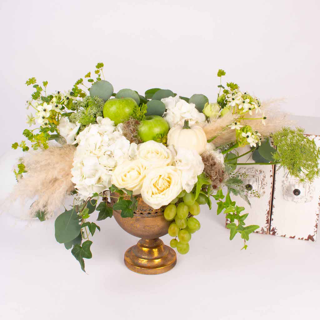 Aranjament in urna aurie cu 3 trandafiri albi, hortensie alba, bostan mic alb, lisianthus alb, verdeata si alte flori de decor.