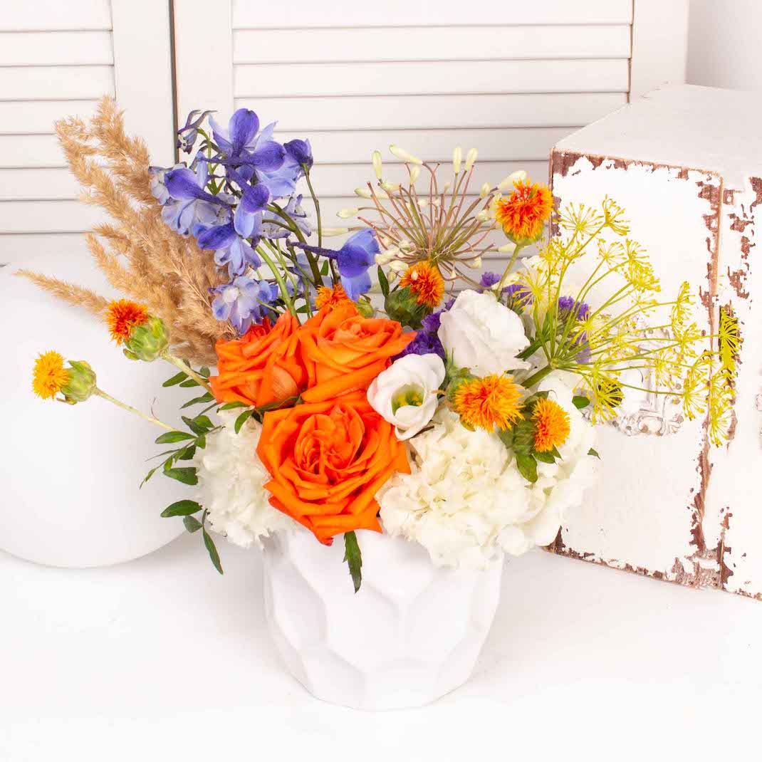Iubim emotiile si bucuria pe care le vedem pe chipul celor care primesc flori si aranjamente florale pregatite in floraria Purple Flowers. De aceea ne straduim de fiecare data sa cream aranjamente unice care sa surprinda prin forma si culoare. Acest aranjament cu trandafiri portocalii, lisianthus alb si alte flori este cadoul de care ai nevoie atunci cand vrei sa spui „Te iubesc!” unei persoane dragi.