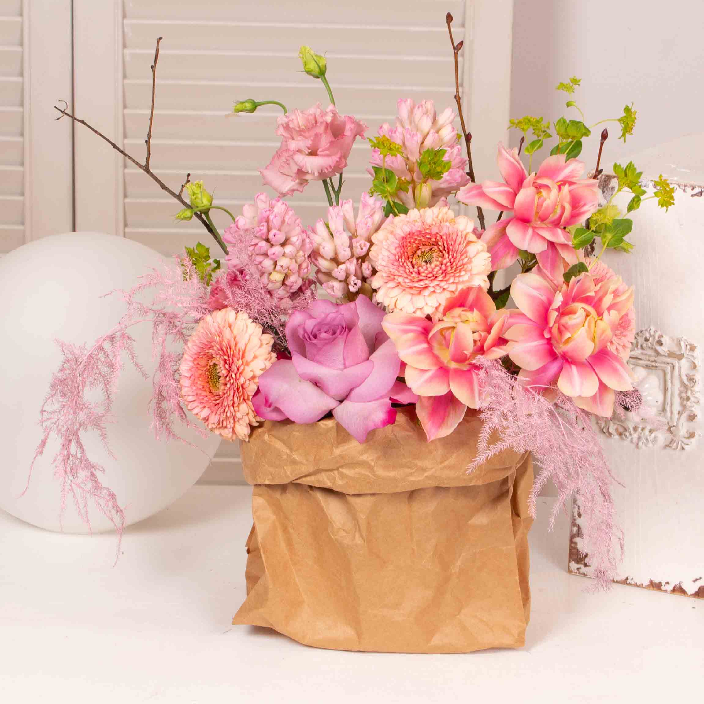 Aranjament in punga maro, 3 lalele roz, 3 germini, 3 zambile, lisianthus roz, verdeata si alte flori de decor.
