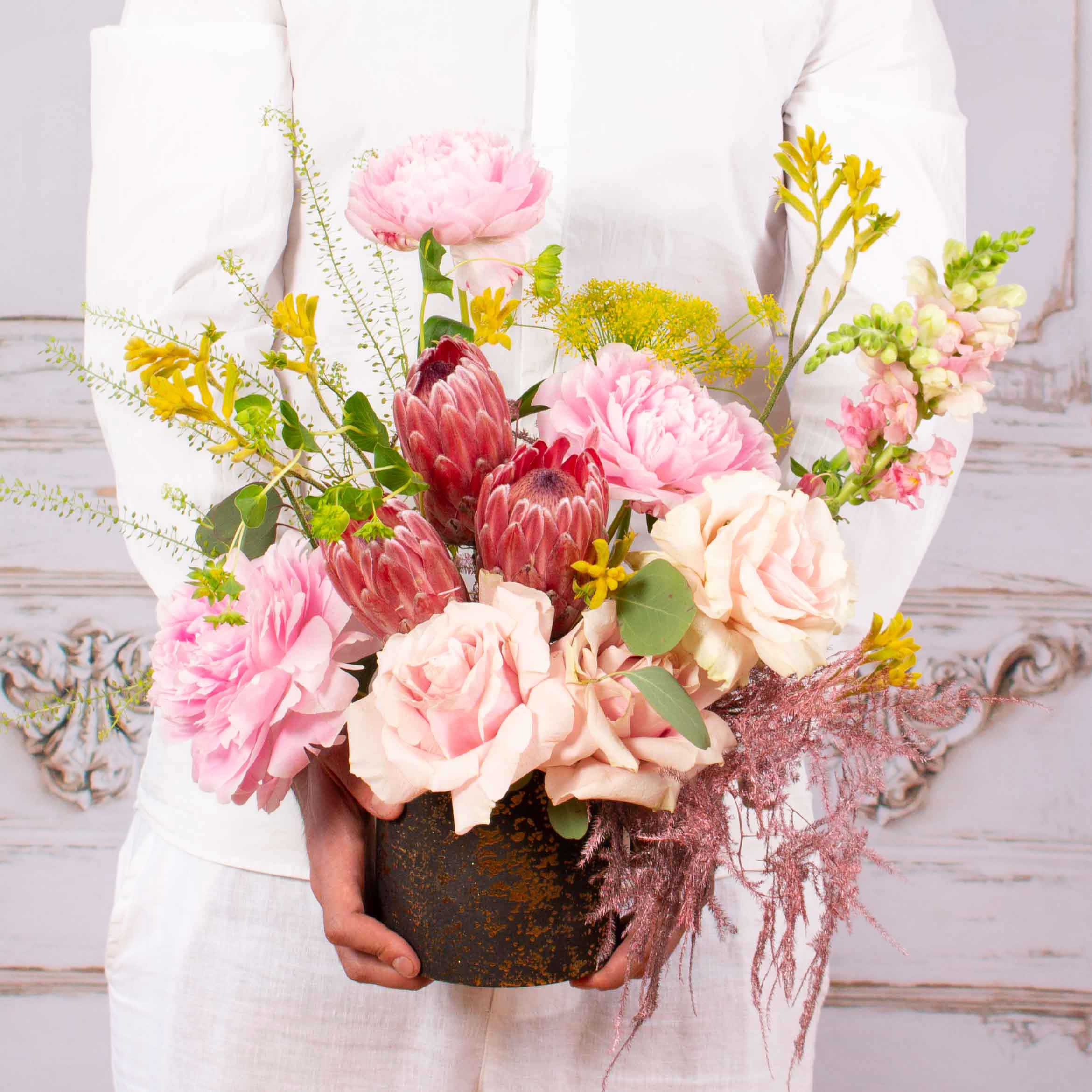 Exprima-ti sentimentele in flori si daruieste aceast aranjament cu proteea, bujori si alte flori persoanei dragi. Florile acestea vor insenina ziua sotiei, mamei, iubitei, colegei sau sefei tale! Adauga mesajul tau personalizat iar noi pornim de indata sa o surprindem cu acest aranjament deosebit.