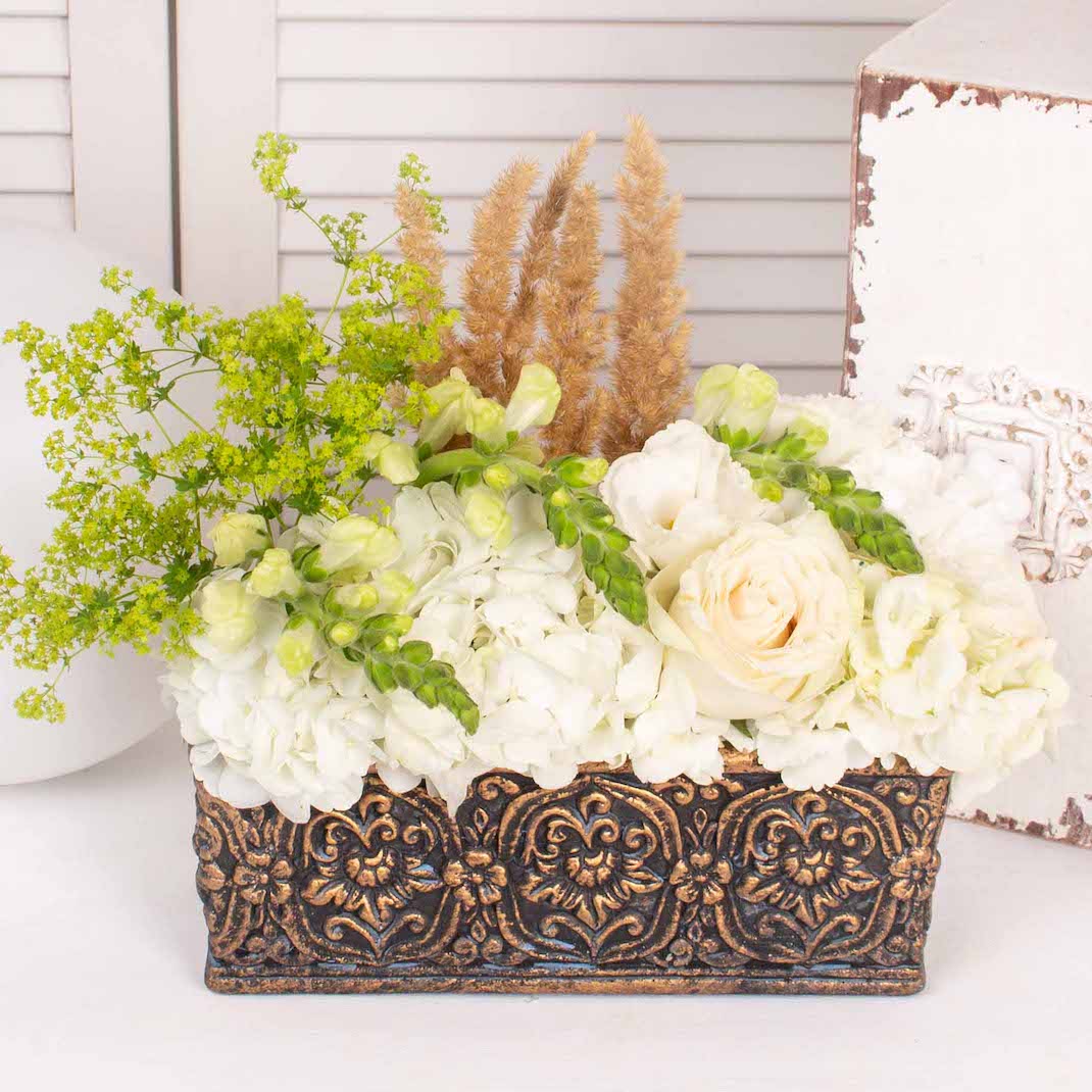 Aranjament in vas ceramic cu hortensia alba, trandafir alb, lisianthus alb, 3 antirrhinum alb, verdeata si alte flori de decor.