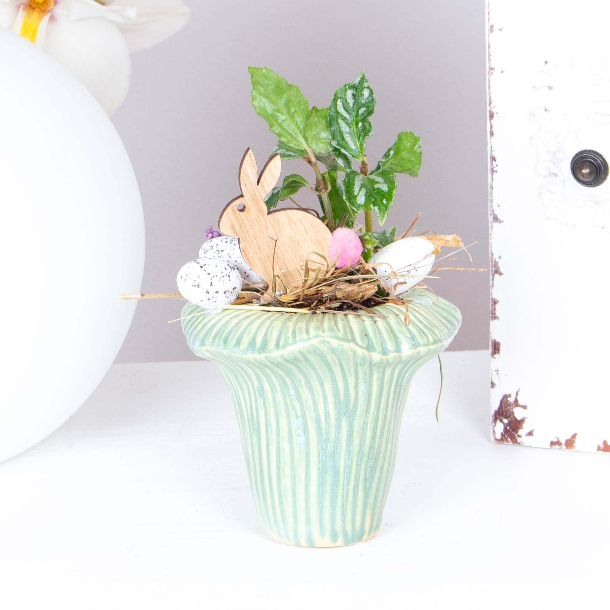 Aranjament in vas ceramic cu figurina iepuras din lemn, 2 plante pilea si alte elemente de decor.