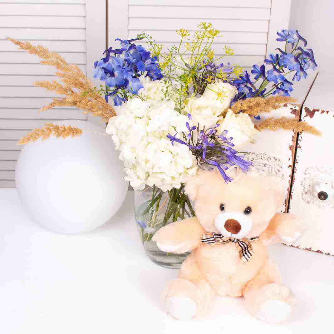 Din grija pentru mediu, ne dorim sa avem produse cat mai prietenoase cu acesta. Ce ne ofera florile e arta si terapie iar noi ar trebui sa ne asiguram ca respectam natura ce ni le-a daruit.Tocmai de aceea realizam aceste produse eco si ne-am luat angajamentul ca intreg magazinul Purple Flowers sa devina eco-friendly in cel mai scurt timp posibil. Din cauza faptului ca nu este biodegradabil si nici reciclabil, scopul nostru este de a elimina in viitor buretele floral din compozitiile produselor noastre. Acest aranjament in vaza cu trandafiri albi , hortensie , anthirinum si alte flori la care am adaugat un ursulet de plus este alegerea perfecta pentru a face o surpriza unei persoane dragi.