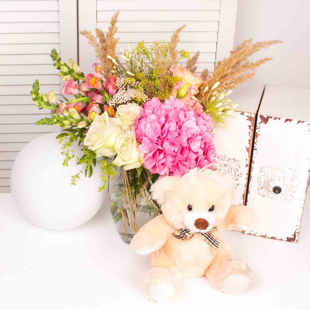 Din grija pentru mediu, ne dorim sa avem produse cat mai prietenoase cu acesta. Ce ne ofera florile e arta si terapie iar noi ar trebui sa ne asiguram ca respectam natura ce ni le-a daruit.Tocmai de aceea realizam aceste produse eco si ne-am luat angajamentul ca intreg magazinul Purple Flowers sa devina eco-friendly in cel mai scurt timp posibil. Din cauza faptului ca nu este biodegradabil si nici reciclabil, scopul nostru este de a elimina in viitor buretele floral din compozitiile produselor noastre. Acest aranjament in vaza cu trandafiri albi , hortensie , anthirinum si alte flori la care am adaugat un ursulet de plus este alegerea perfecta pentru a face o surpriza unei persoane dragi.