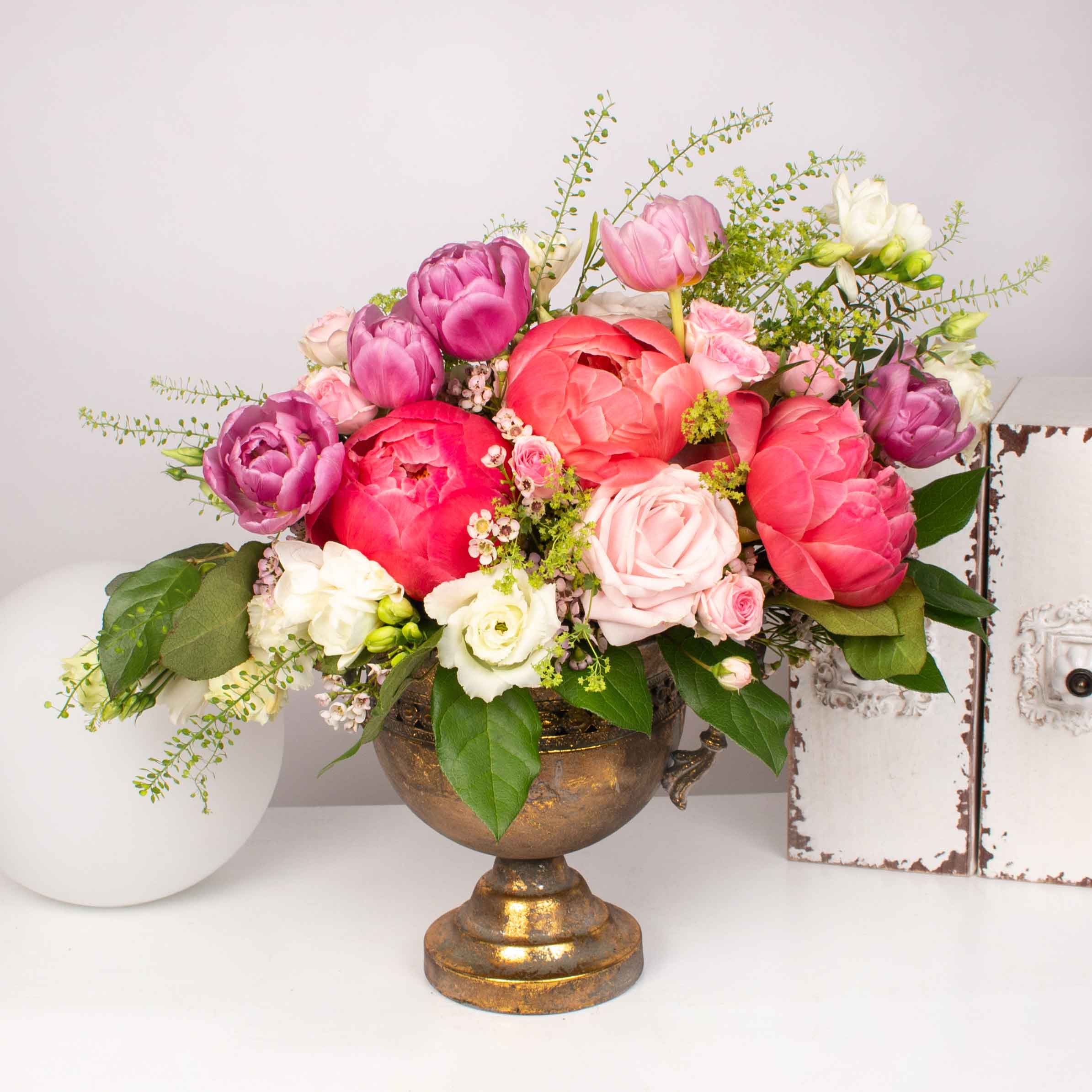 Urna aurie cu 3 bujori corai, 2 fressia alb, 5 lalele mov-roz, trandafir roz, verdeata si alte flori de decor.