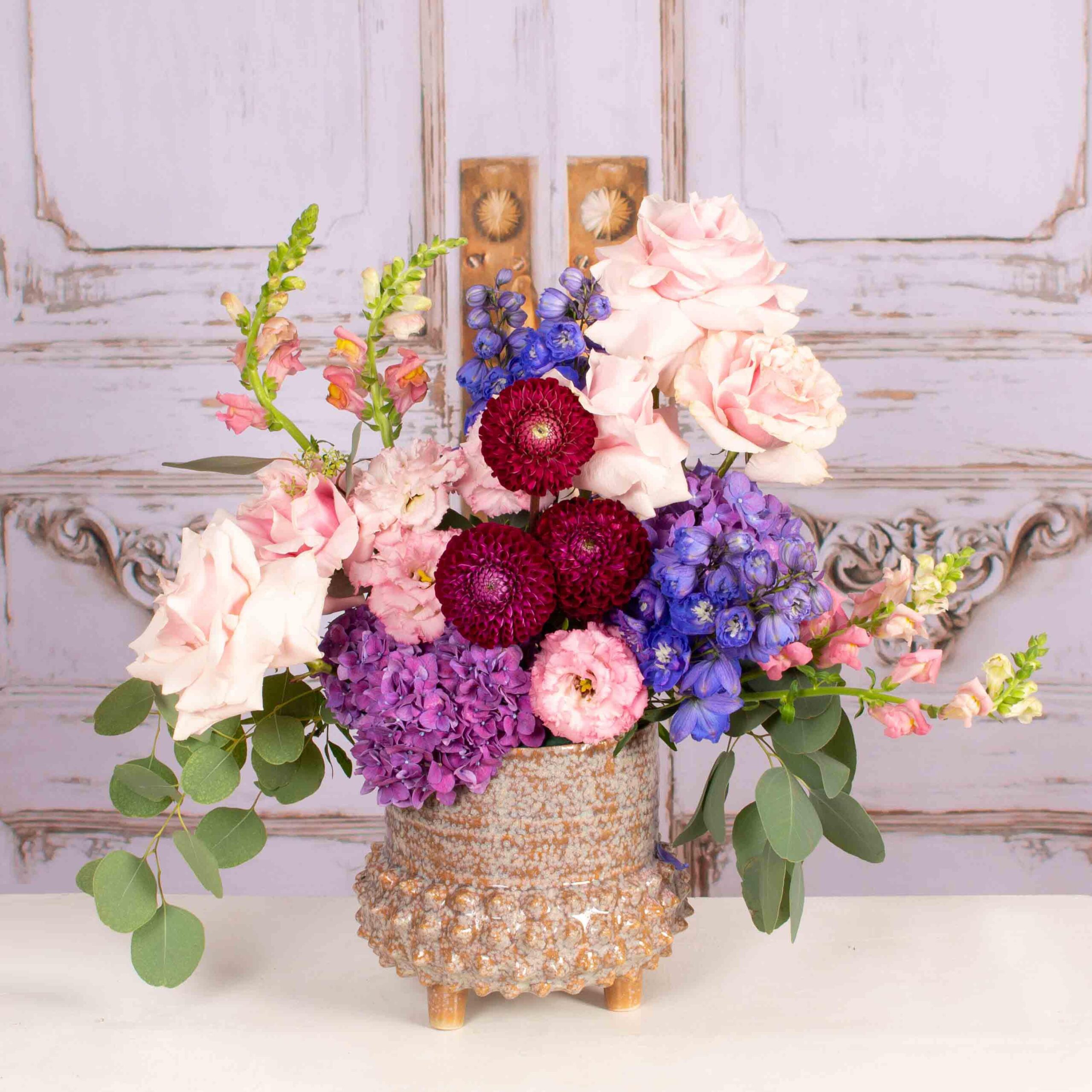Iubim emotiile si bucuria pe care le vedem pe chipul celor care primesc flori si aranjamente florale pregatite in floraria Purple Flowers. De aceea ne straduim de fiecare data sa cream aranjamente unice care sa surprinda prin forma si culoare. Acest aranjament cu trandafiri, delphiunium si alte flori este cadoul de care ai nevoie atunci cand vrei sa spui „Te iubesc!” unei persoane dragi.