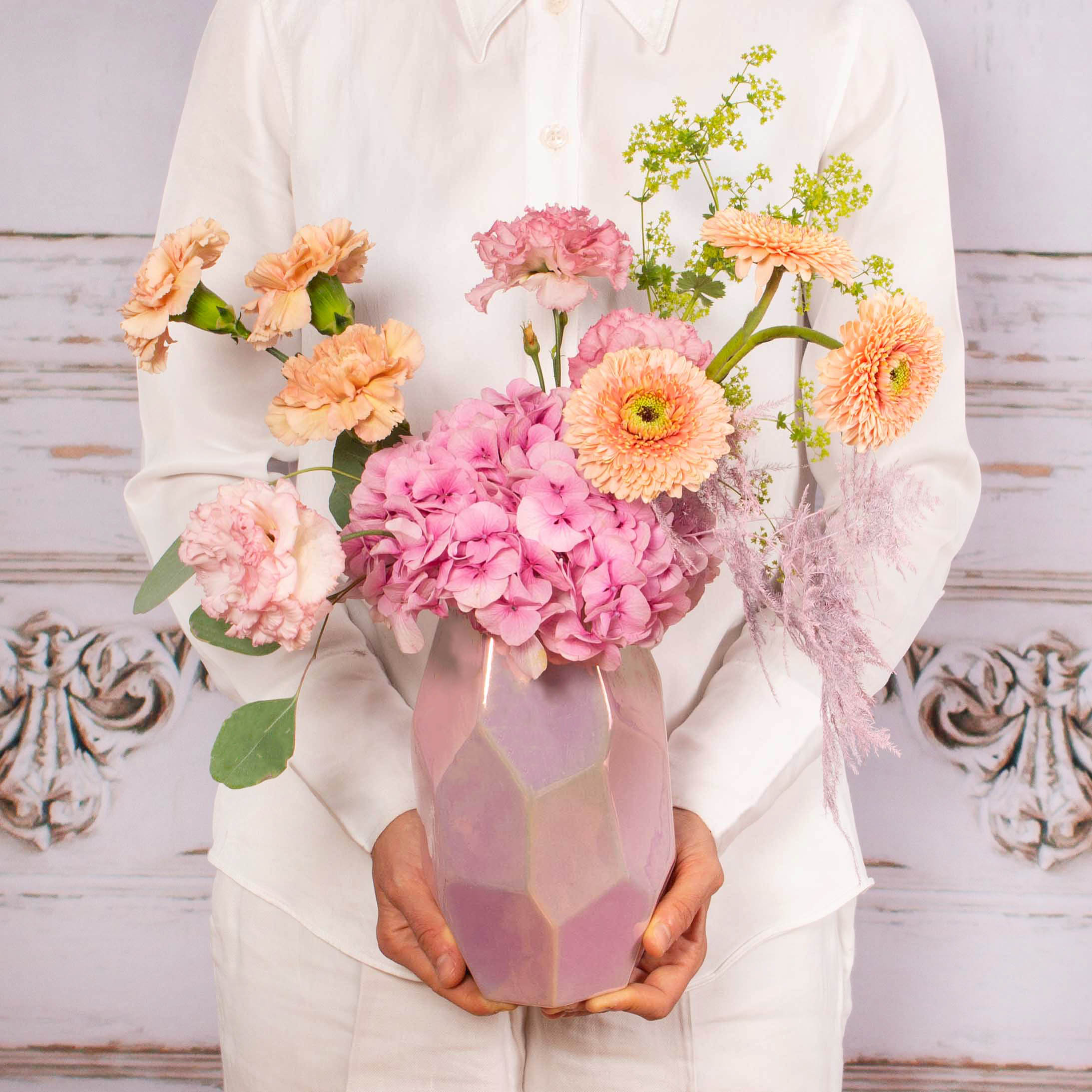 Aranjament in vaza ceramica (vaza este inclusa in pret) cu hortensia, 3 garoafe, 3 germini, lisianthus roz, verdeata si alte flori de decor.