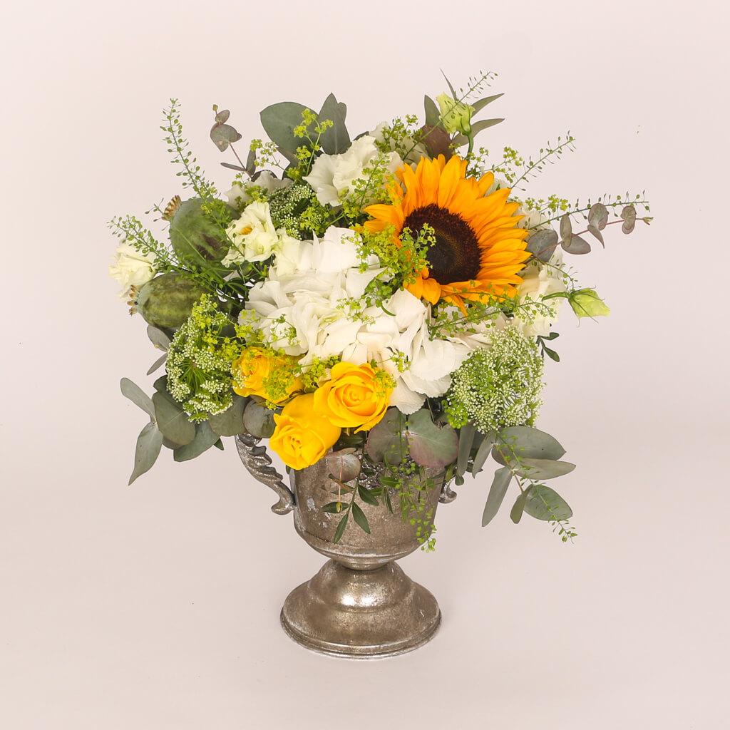 Aranjament cu urna metalica, hortensia alba, floarea soarelui, 3 trandafiri galbeni, 2 lsiianthus alb, verdeata si alte flori de decor.