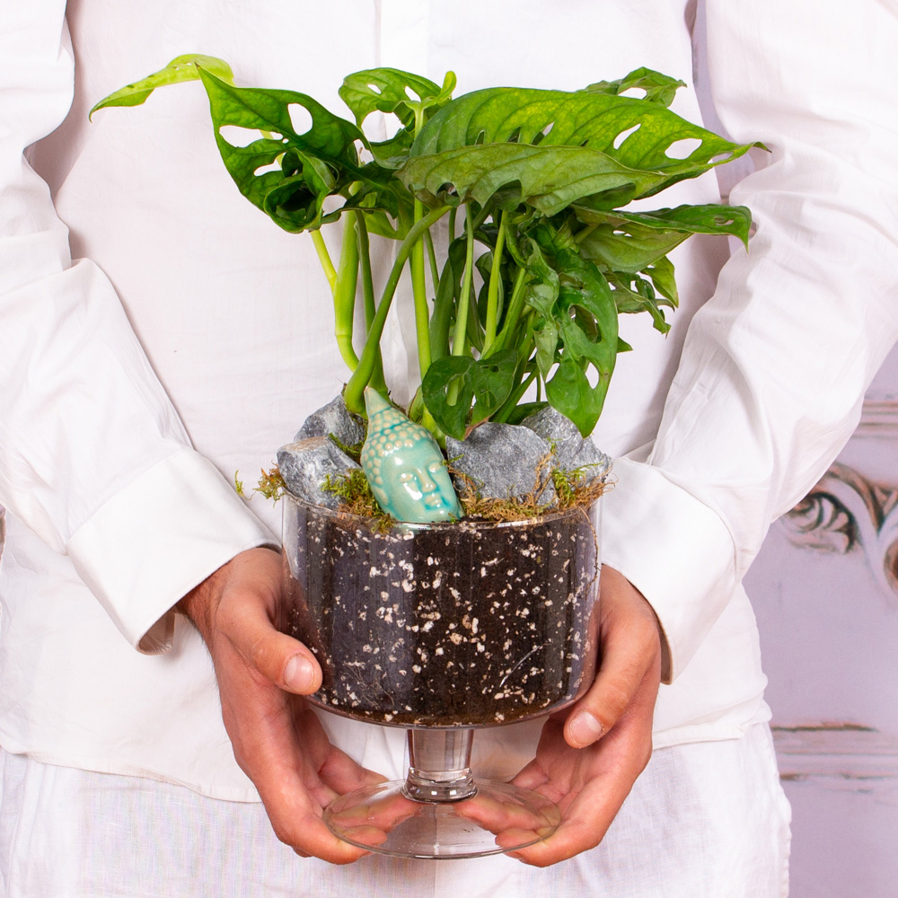 Pretuim tot ce are natura mai bun si mai frumos de oferit, asadar am pregatit acest terariu cu monstera special pentru tine sau cineva drag. Aranjamentele cu plante verzi si plante cu flori rezista mai mult si in plus, purifica aerul din casa sau biroul tau. Acest terariu este cadoul perfect pentru iubitorii de plante.