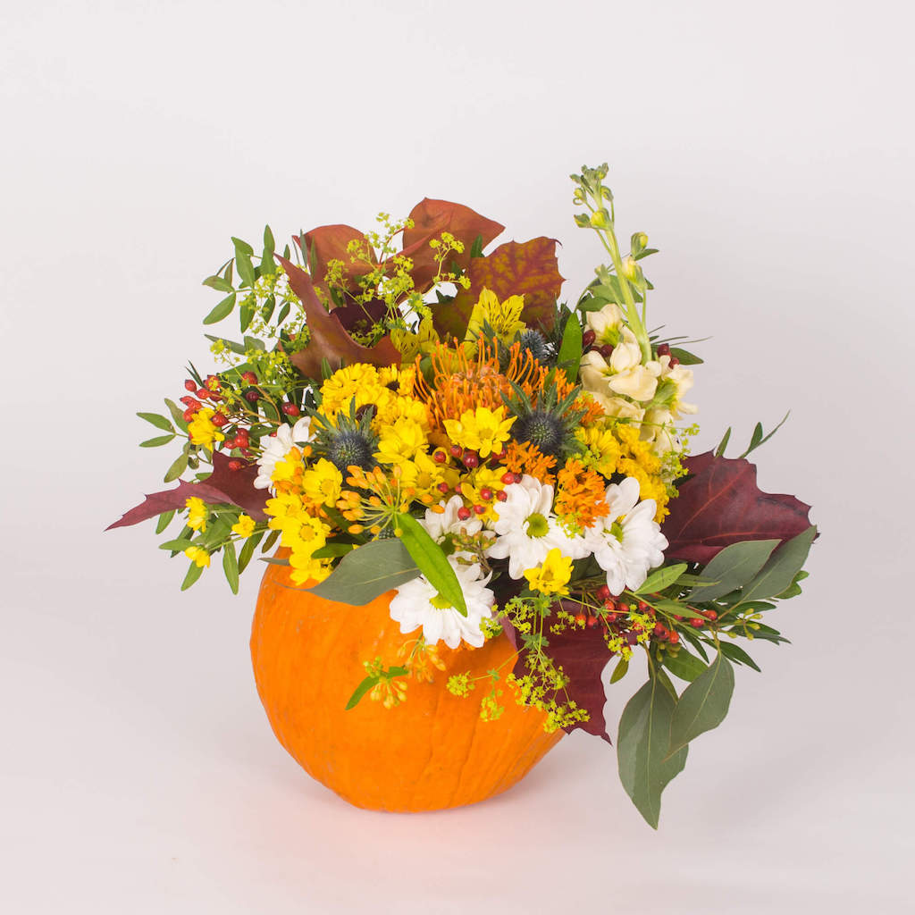 Aranjament cu bostan, 2 crizanteme galbene, proteea portocaliu, matthiola, verdeata si alte flori de decor.