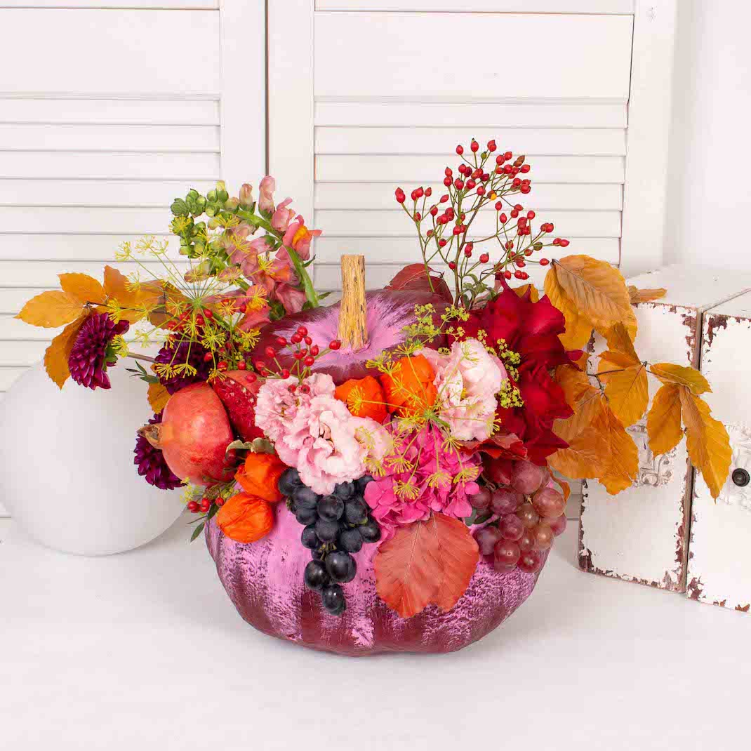 1 recenzie pentru Aranjament in bostan cu struguri, rodie si trandafiri rosii