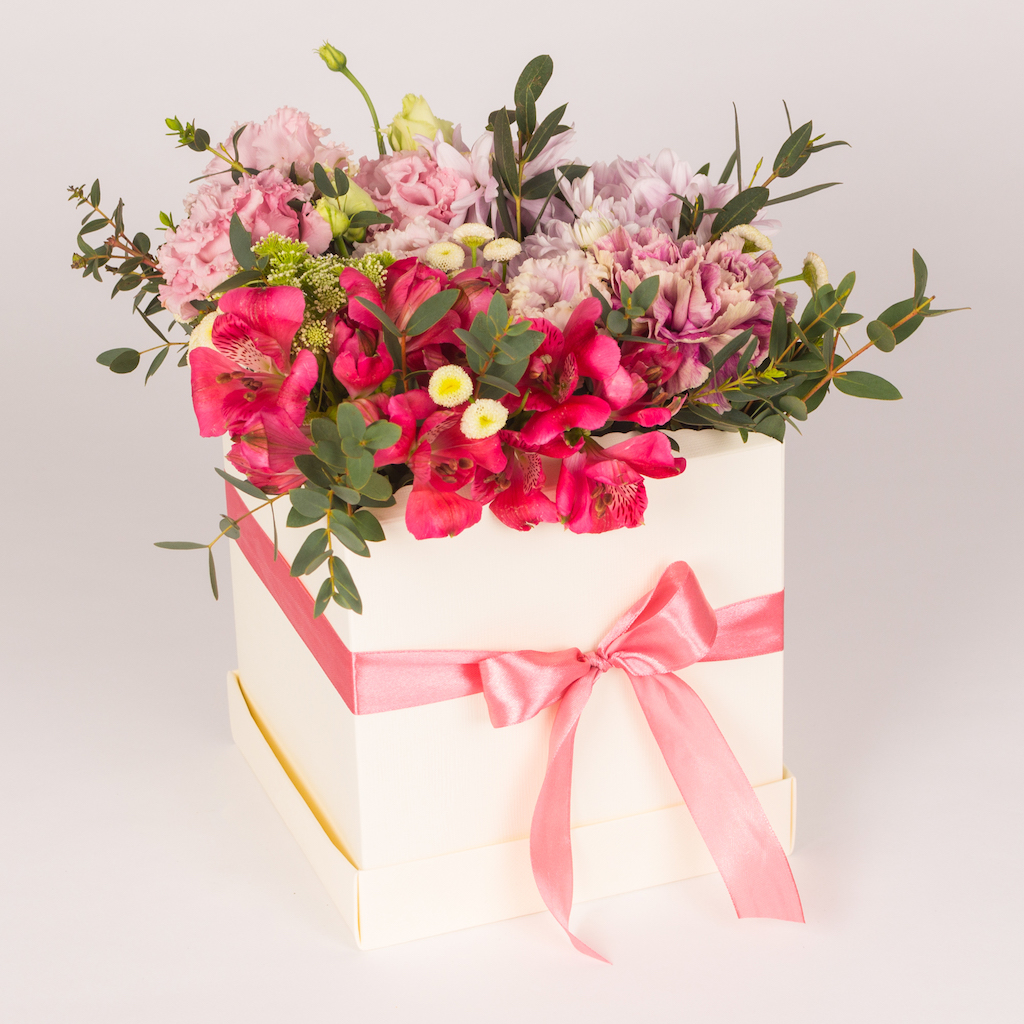 Cutie ivoire cu garoafa, 2 lisianthus roz, 2 alstromeria roz, verdeata si alte flori. Dimensiunile cutiei: 17x17x17 cm.
