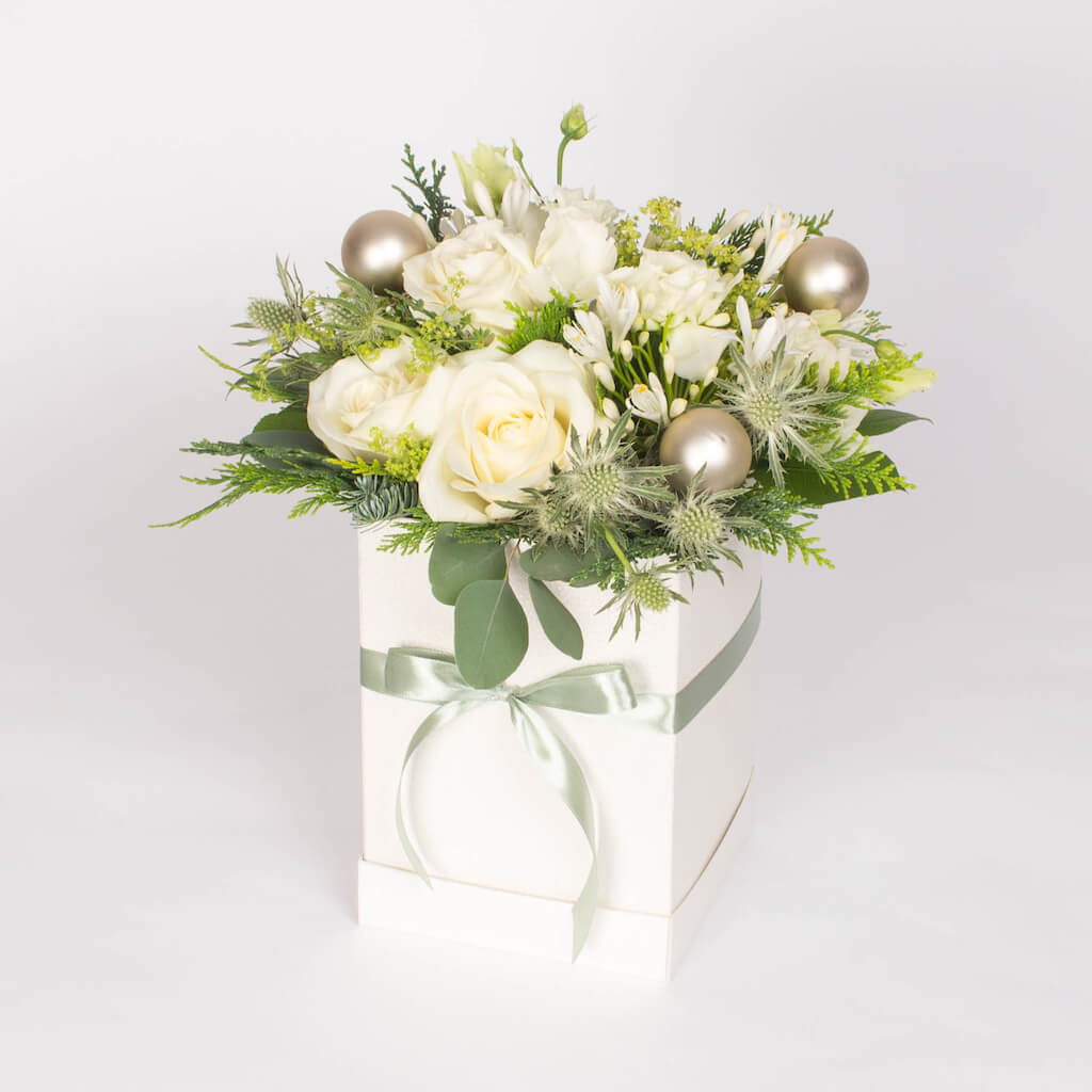 Cutie ivoire cu 3 trandafiri albi, 3 agapanthus alb, lisianthus alb, verdeata si alte flori. Dimensiunile cutiei: 14x14x14 cm
