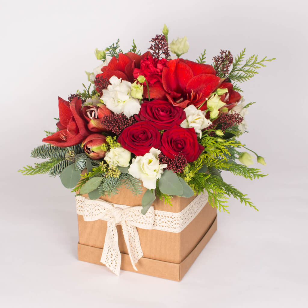 Cutie maro cu 3 amaryllis rosu, 3 trandafiri rosii, 2 lisianthus alb, verdeata si alte flori. Dimensiunile cutiei: 20x20x20 cm