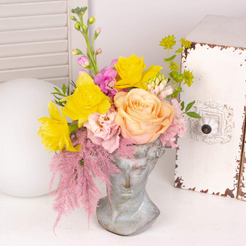 Primavara ne bucura privirea cu cele mai frumoase flori si cele mai expresive culori. Am strans acest aranjament in statuie Antique cu zambile, narcise, trandafiri peach cu cele mai bune ganduri si cele mai sincere urari. Daruieste-l mai departe celor pe care ii indragesti si spune-le „O primavara frumoasa!” in cel mai frumos mod, prin flori pline de viata. Potrivit persoanelor deschise, comunicative si care apreciaza iesirile in natura, acest aranjament cu flori de sezon este cadoul potrivit pentru a le face sa zambeasca din plin.