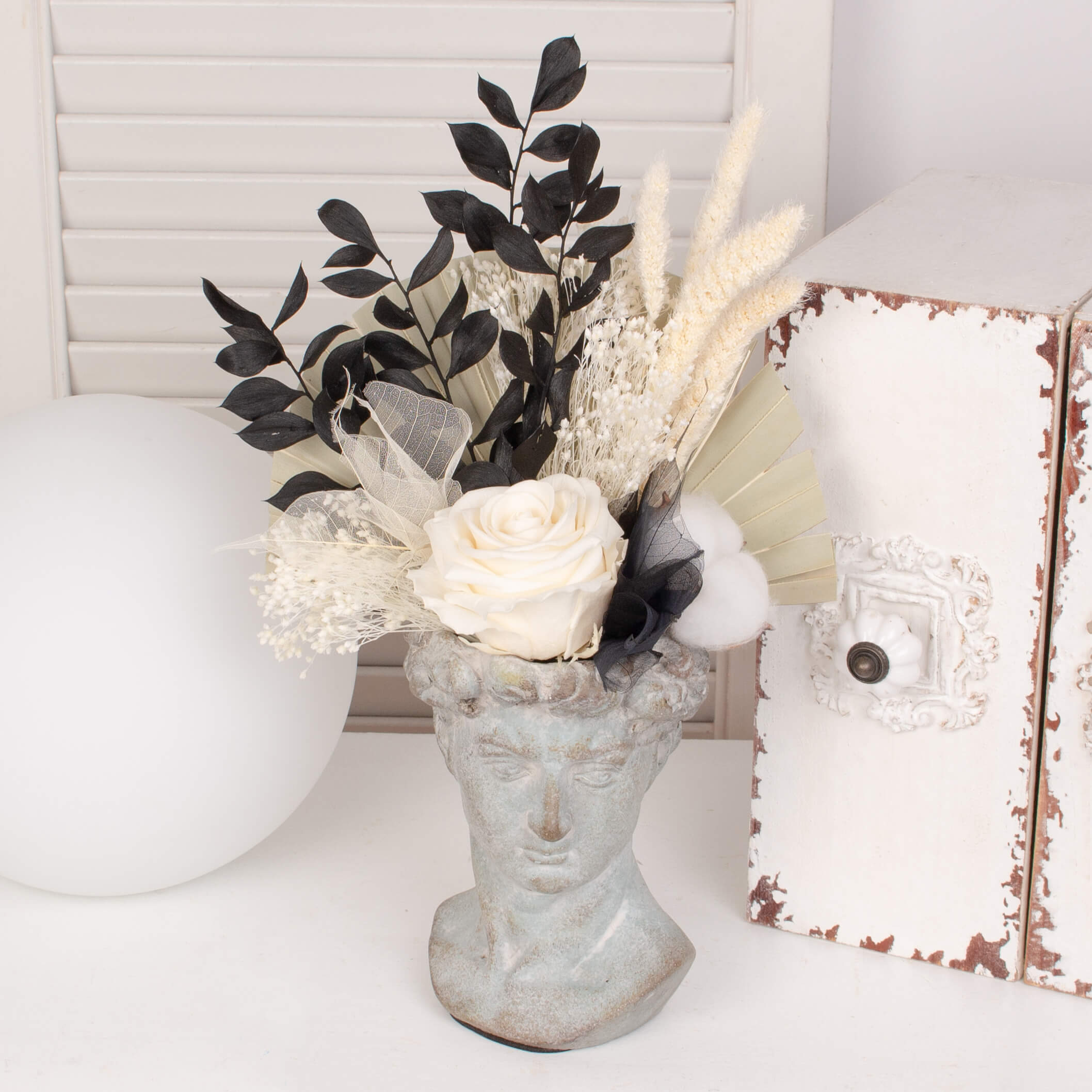 Vaza antichizata cu trandafir conservat alb, palmier conservat, cupa de bumbac, 5 skeleton leaves negru si alte flori de decor.