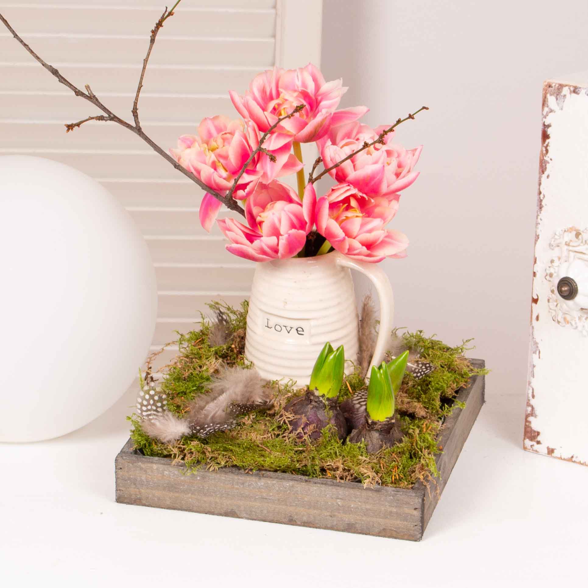 Florile sunt cel mai frumos cadou al naturii. Fie ca vrei sa-i faci o surpriza frumoasa mamei, surorii sau iubitei tale, acest aranjament cu bulbi de zambila , lalele si alte decoratiuni este cea mai buna alegere. Adauga un mesaj din inima si vei reusi sa o faci sa se simta iubita si rasfatata.