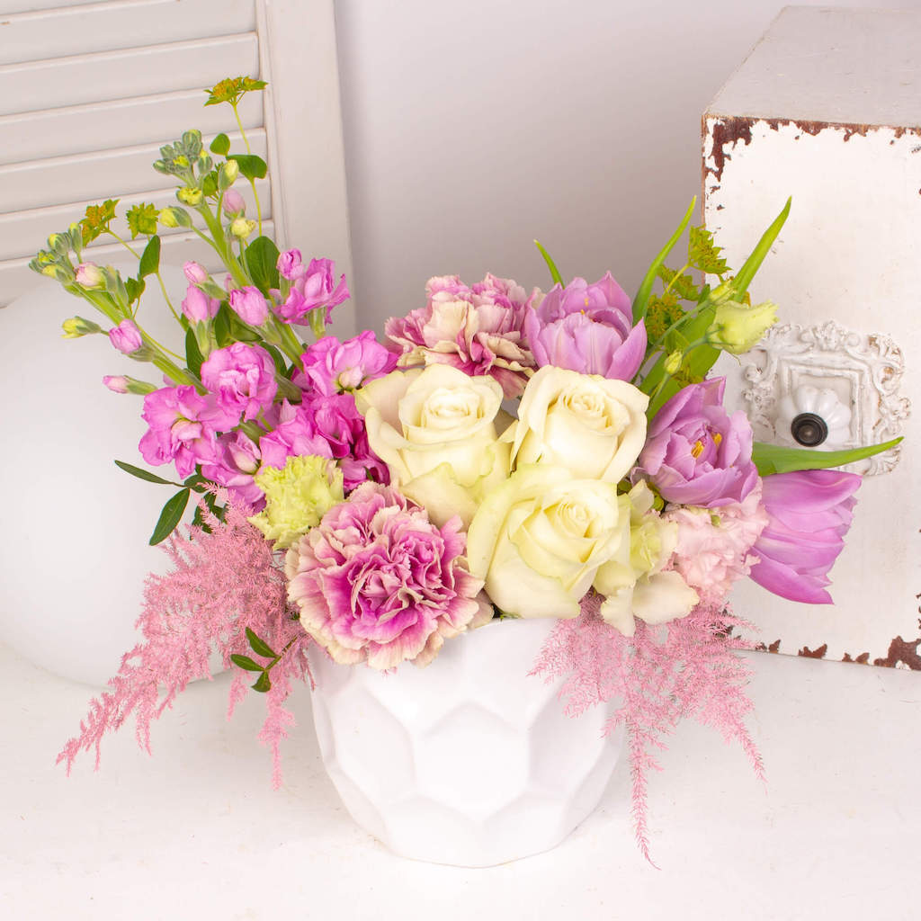 Aranjament in vas ceramic cu 3 trandafiri albi, 2 garoafe, 3 lalele mov, 2 matthiola, 2 asparagus roz, lisianthus roz, verdeata si alte flori de decor.