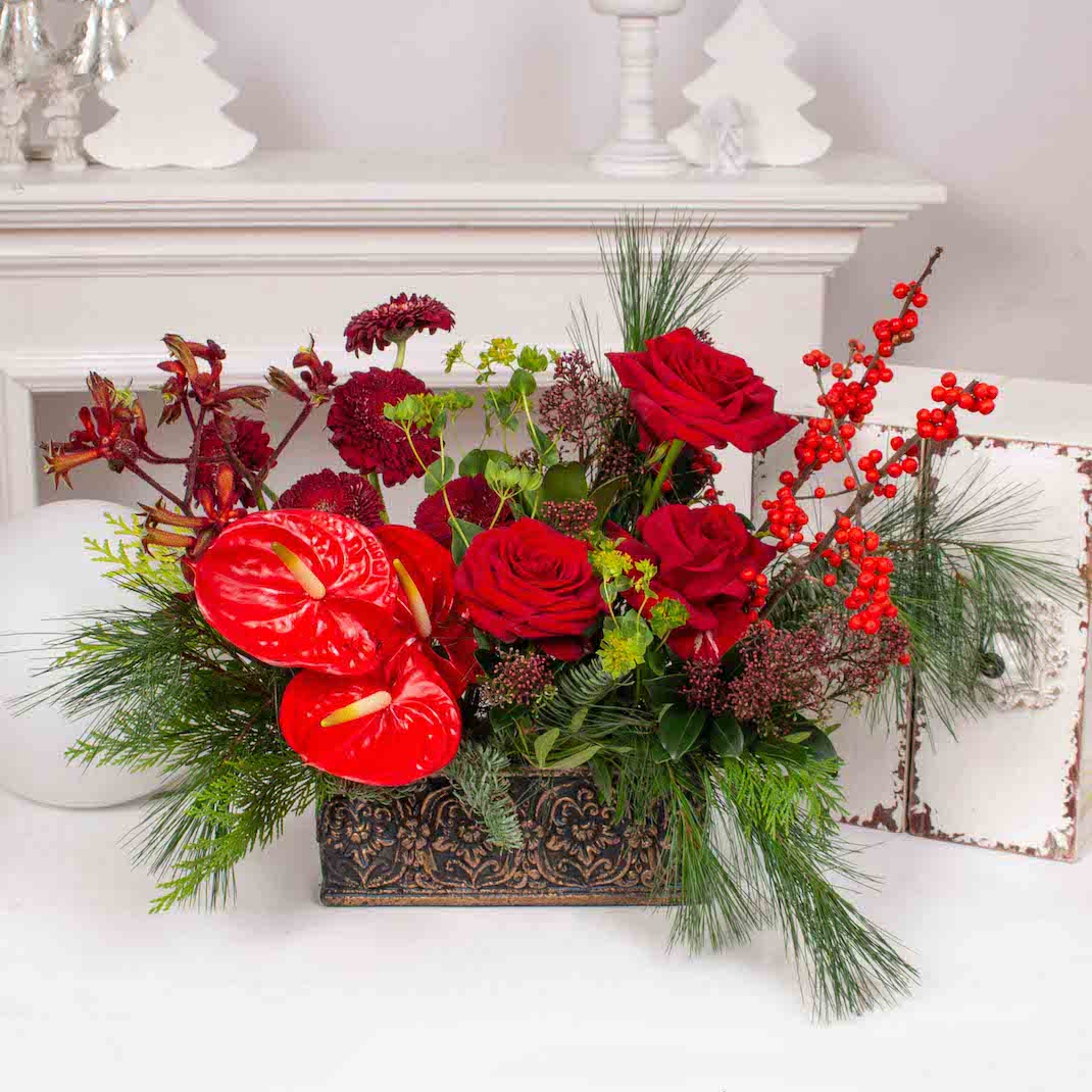 Aranjament de Craciun cu anthurium, trandafiri si alte flori