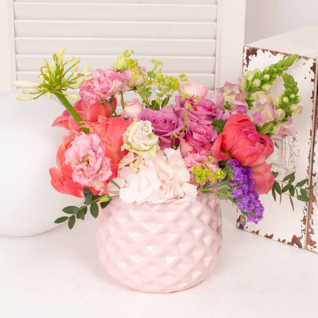 Aranjament in vas roz cu 3 trandafiri mov, 2 anthirinum roz, 3 bujori corai, lisianthus roz, verdeata si alte flori de decor.