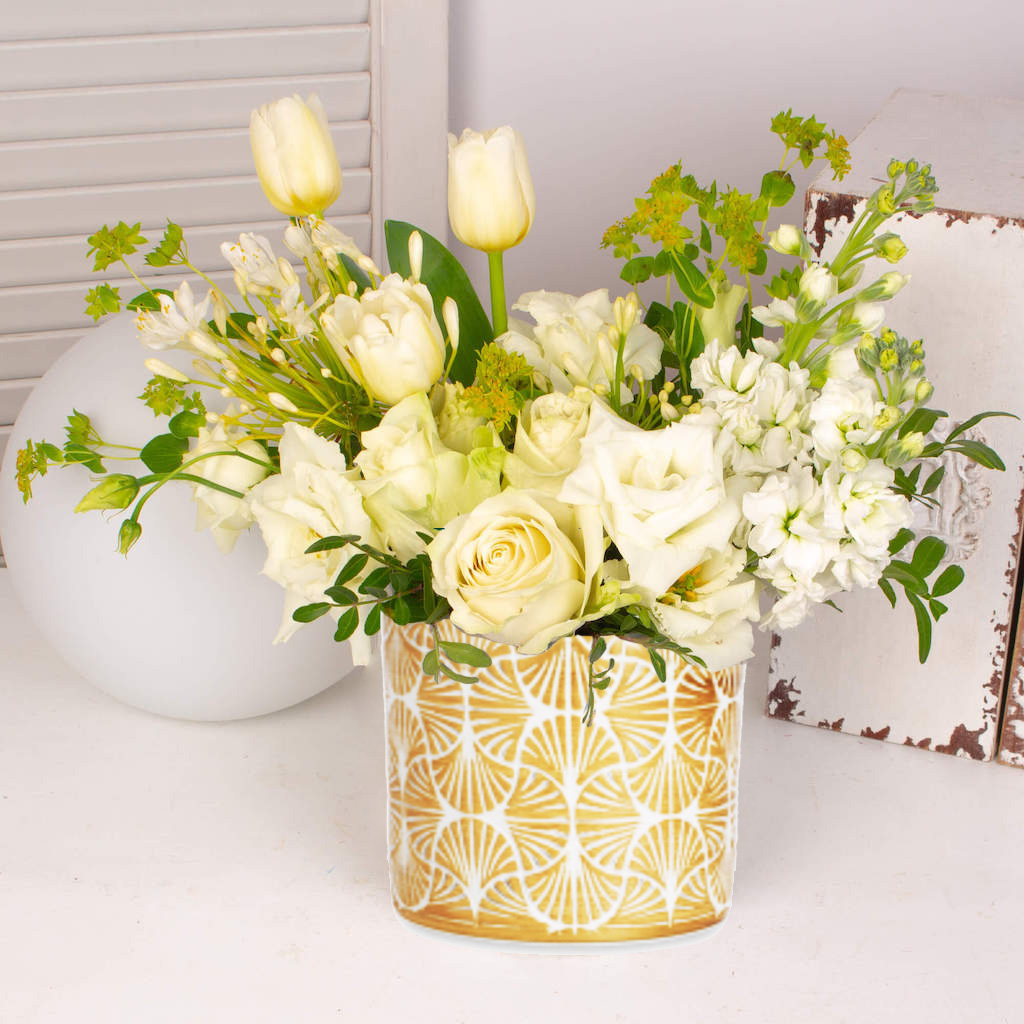 Aranjament in vas ceramic cu 3 trandafiri albi, 3 lalele albe, 2 agapanthus alb, 2 lisianthus alb, verdeata si alte flori de decor.