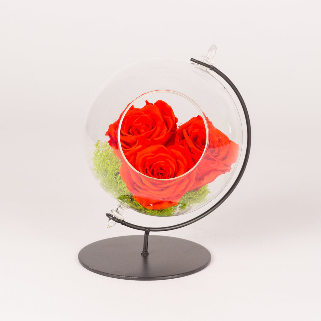 Glob de sticla d16cm h20cm cu 3 trandafiri conservati portocalii, muschi verde si cuib mic.
