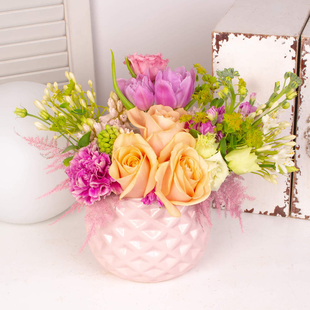 Aranjament in vas ceramic cu 3 trandafiri peach, garoafa, 2 lalele roz, 3 zambile roz, lisianthus alb, agapanthus roz, verdeata si alte flori de decor.