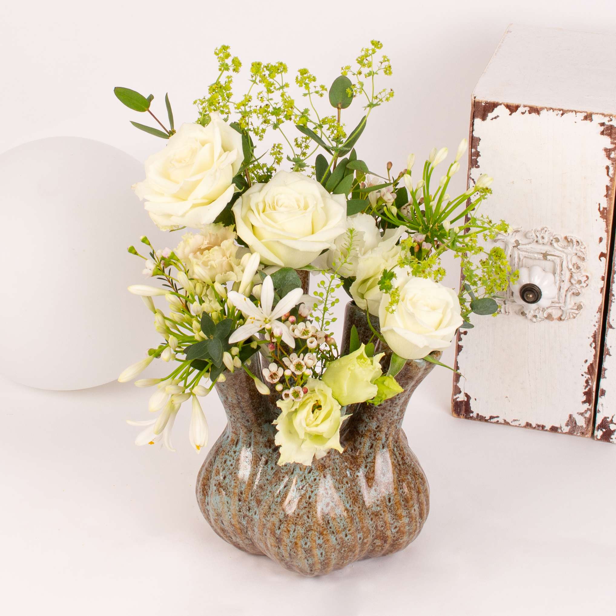 Aranjament cu 2 agapanthus alb, 3 trandafiri albi, lisianthus alb, verdeata si alte flori de decor.