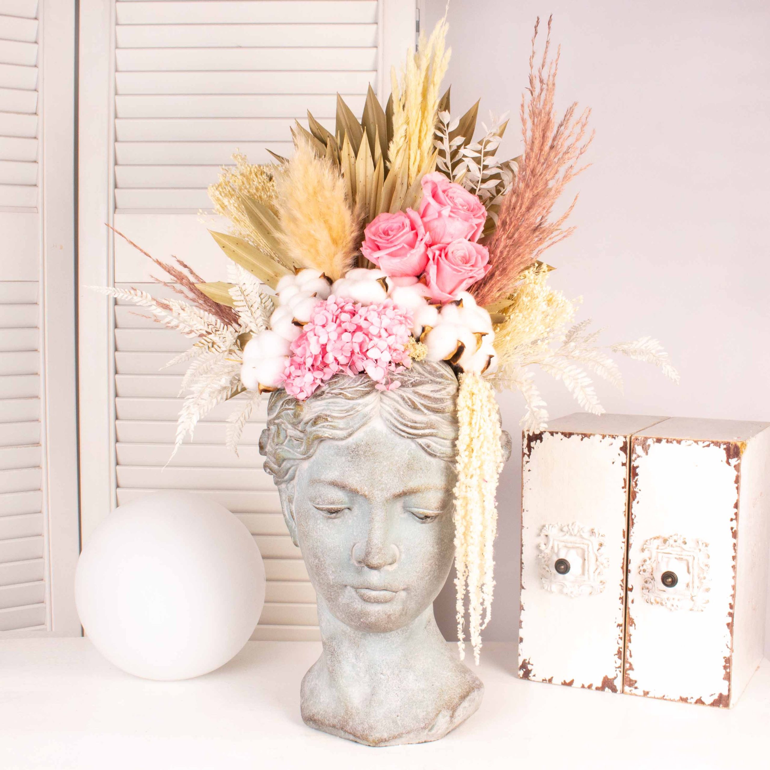 Vaza antichizata cu 3 trandafiri conservati roz, 20 cupe de bumbac, 3. trandafiri roz si alte flori de decor.
