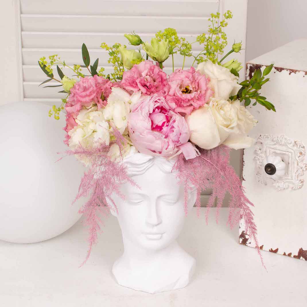 Vaza antichizata cu 3 trandafiri albi, lisianthus roz, bujor roz, hortensie alba, verdeata si alte flori de decor.