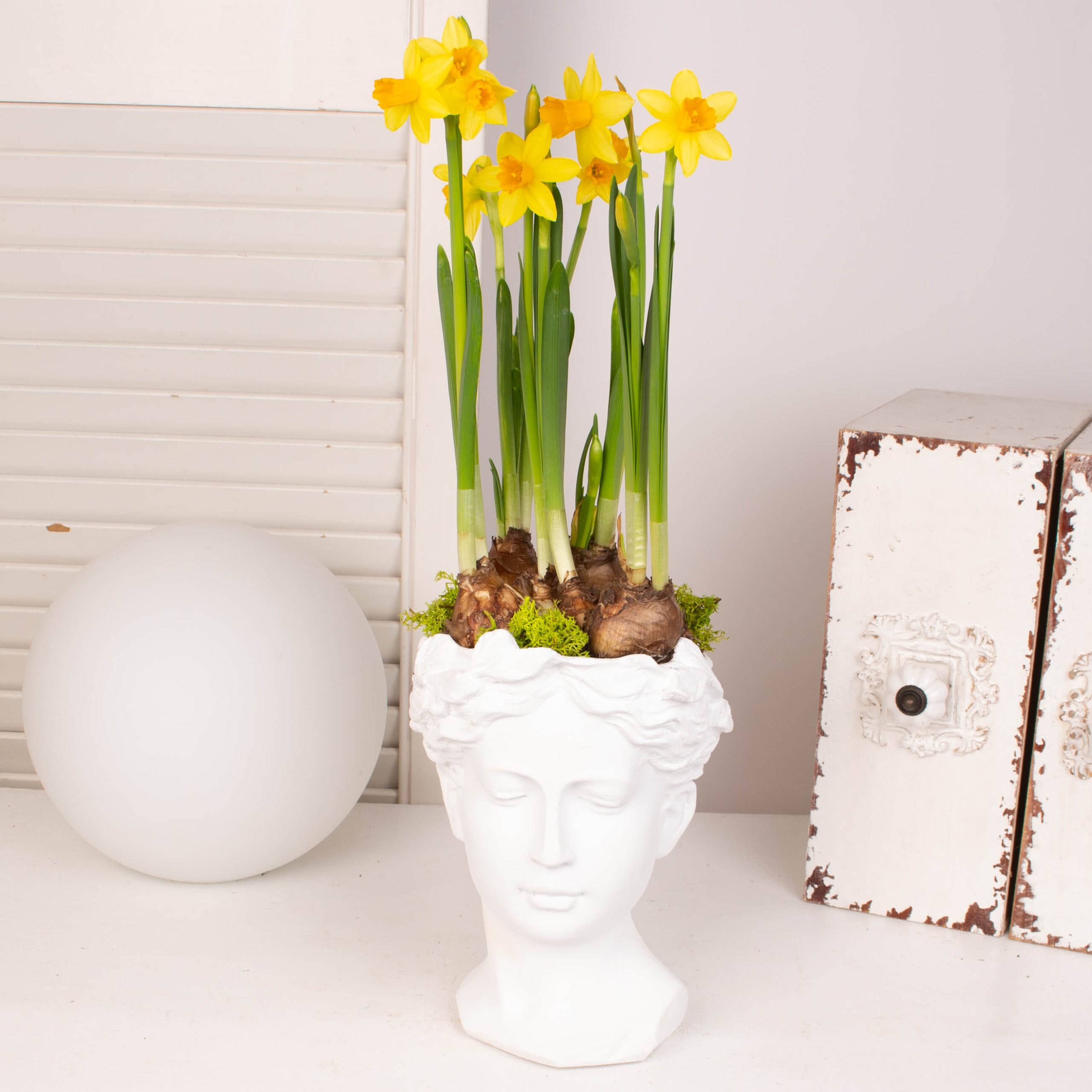 Aranjament in vaza antichizata cu 5 bulbi de narcisa, muschi verde.