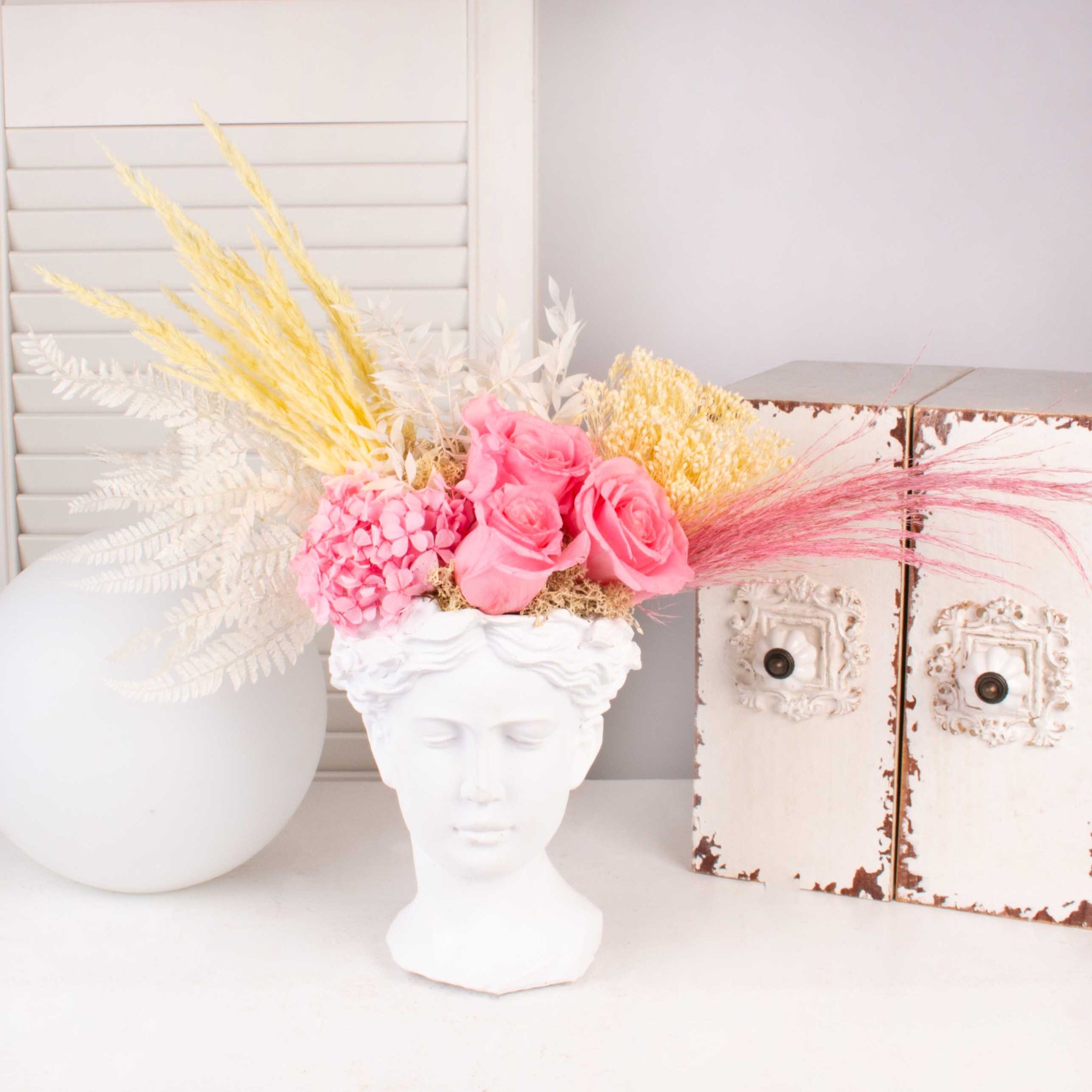 Vaza antichizata cu hortensie conservata roz, pampas roz, 5 cupe de bumbac, 3 trandafiri conservati roz si alte flori conservate.