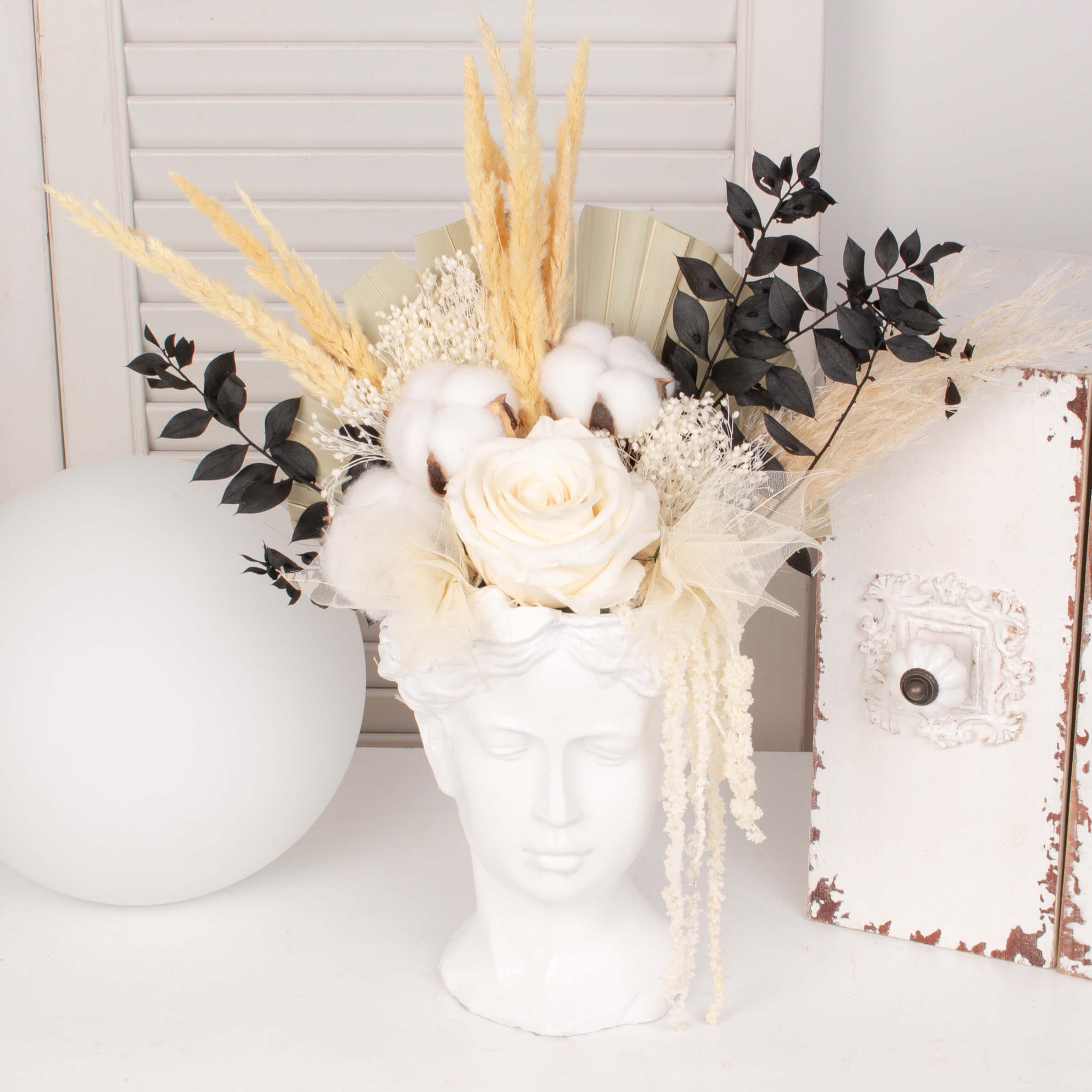 Vaza Venus, trandafir conservat alb, palmier conservat si alte flori conservate