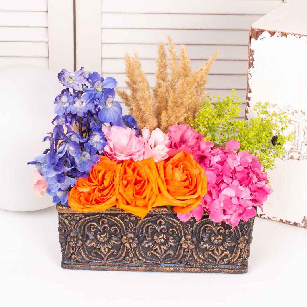 Aranjament in vas dreptunghiuar cu hortensia roz, 3 trandafiri portocalii, lisianthus roz, 3 delphinium, verdeata si alte flori de decor.