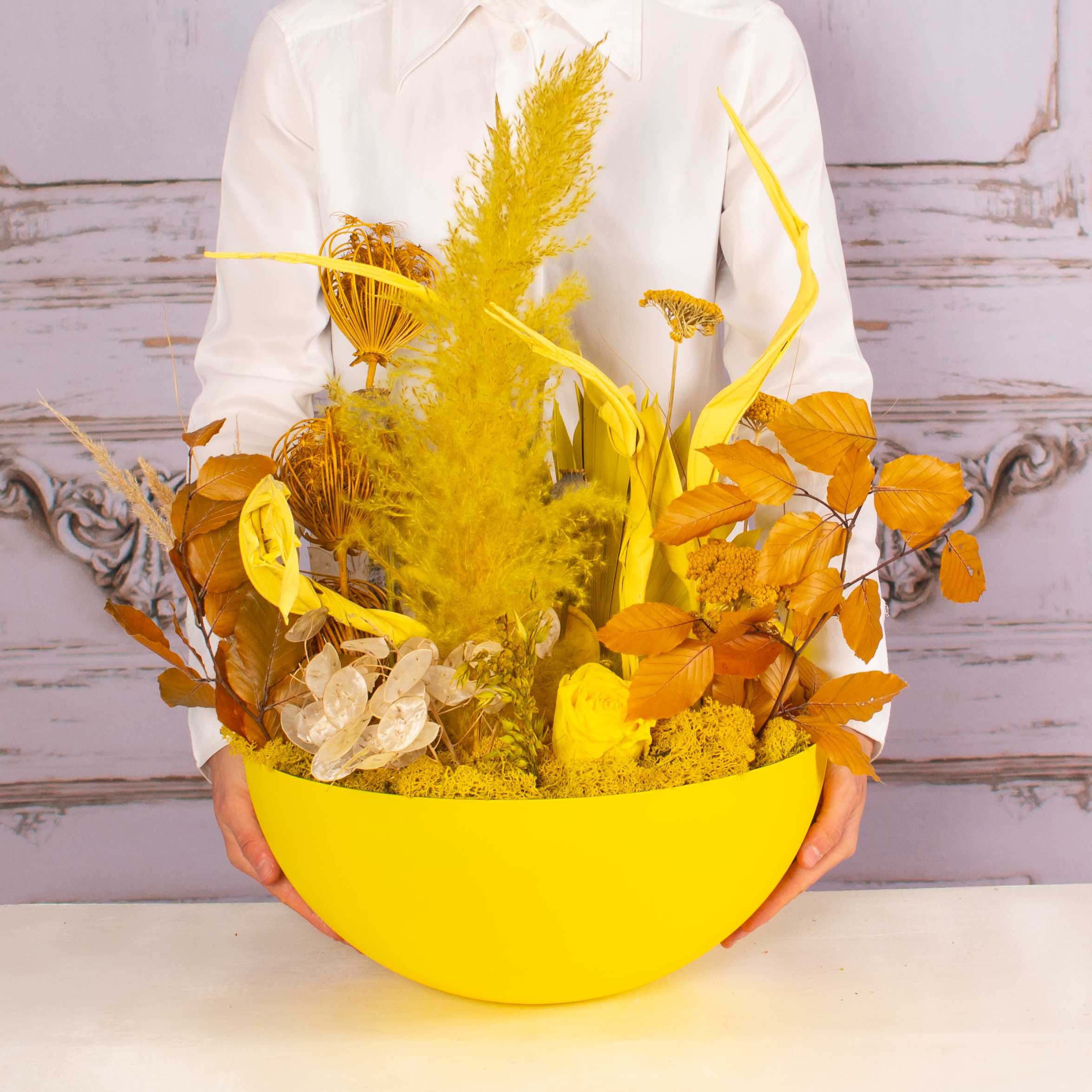Florile daruite din suflet transmit emotii frumoase celor dragi. Iar acest aranjament cu palmier conservat, strelitzia galbena si alte flori si frunze uscate, este cadoul perfect pentru cei care iubesc florile nemuritoare. Este alegerea perfecta pentru a transforma o zi obisnuita intr-o amintire frumoasa care sa reziste peste ani. Cu siguranta un astfel de cadou le va insenina ziua celor dragi! Adauga un mesaj personalizat si transforma o zi banala intr-o amintire frumoasa!