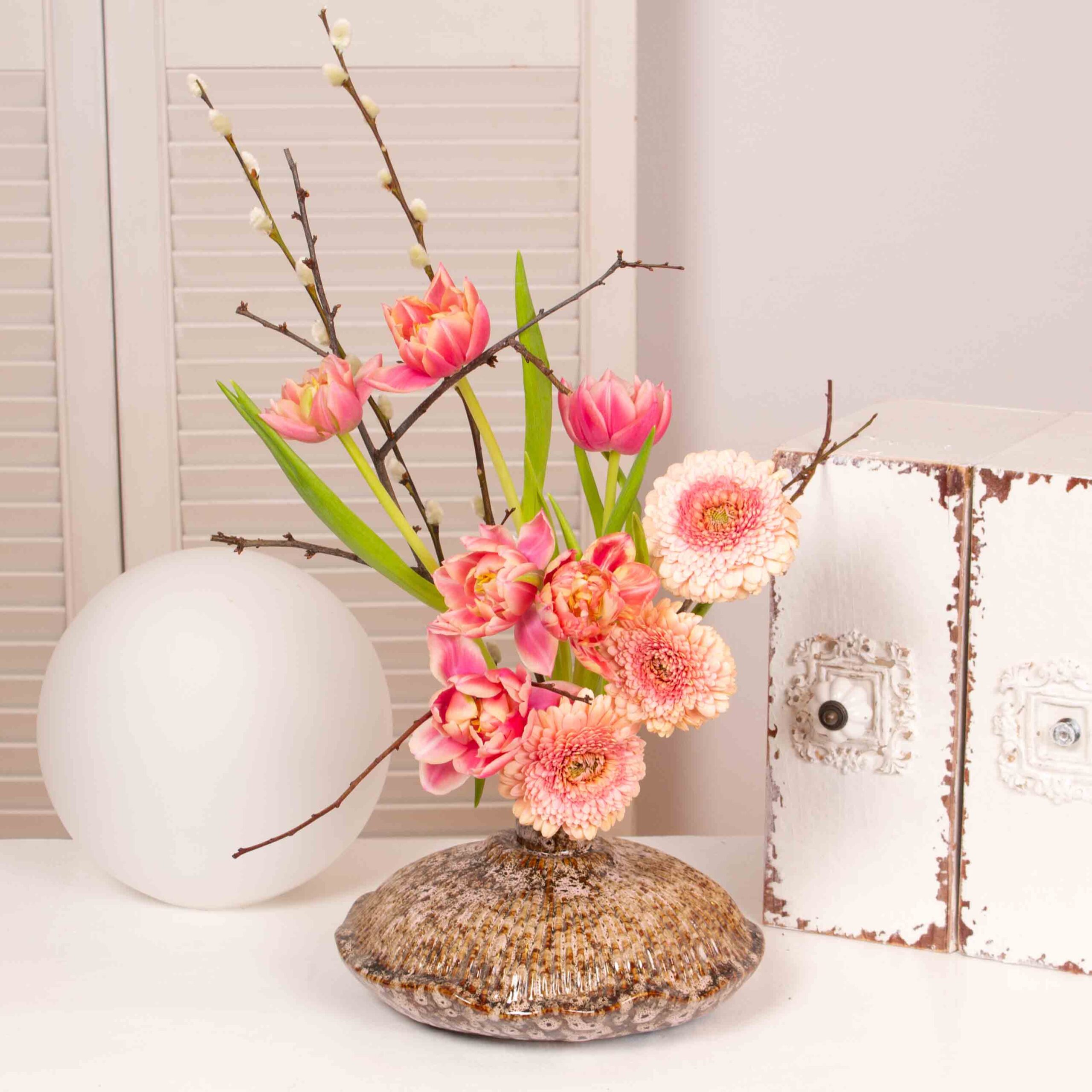 Aranjament in vas ceramic cu 6 lalele roz, 3 germini, 2 salix wilow.