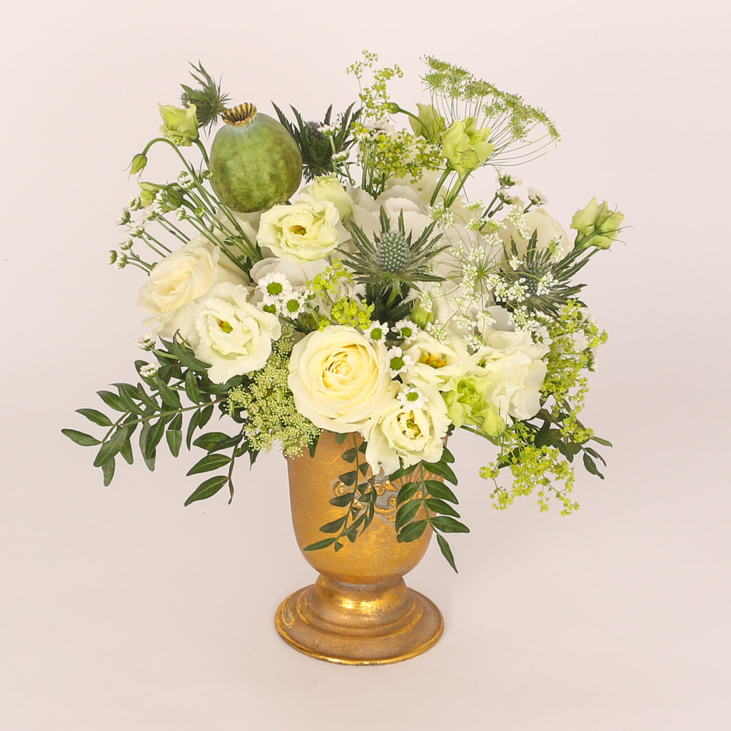 Aranjament cu urna aurie, hortensia alba, 3 trandafiri albi, 2 lisianthus alb, verdeata si alte flori de decor.
