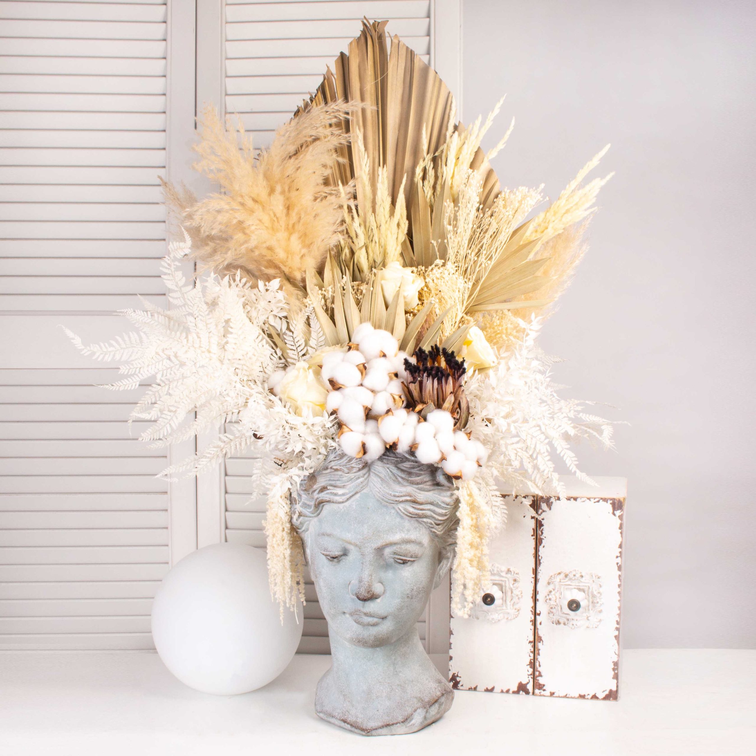 Vaza antichizata cu 3 palmieri conservati, 18 cupe de bumbac, 3 feriga conservata alba, 4 trandafiri conservati albi, flori conservate.