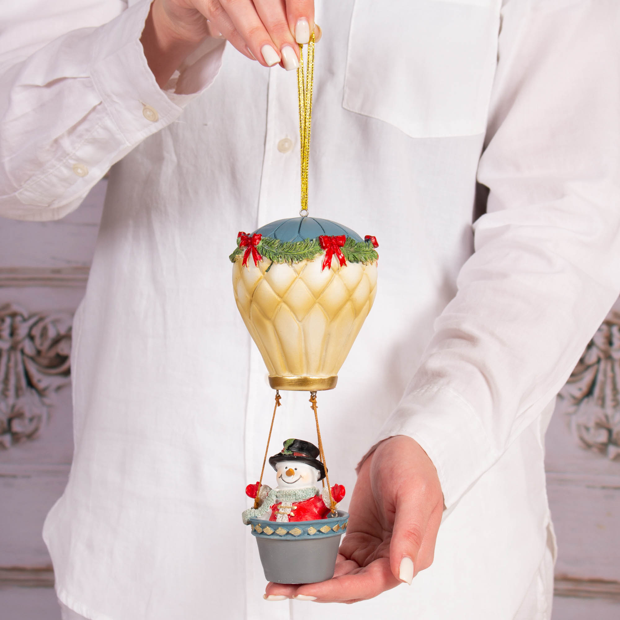 Contine : Balon cu aer cald si om de zapada cu agatatoare 9 x 9 x 22 cm, crem, albastru, din rasina