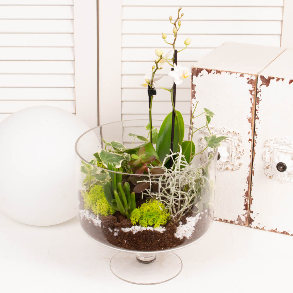 Pretuim tot ce are natura mai bun si mai frumos de oferit, asadar am pregatit acest terariu cu orhidee in suport de sticla, care iti va umple casa de lumina si dorinta de viata. Aranjamentele cu plante au darul de a scoate la iveala bucuria lucrurilor aparent simple, iar noi le iubim pentru asta. Este perfect pentru acasa sau pentru birou, pentru tine sau un cadou perfect pentru cineva drag.