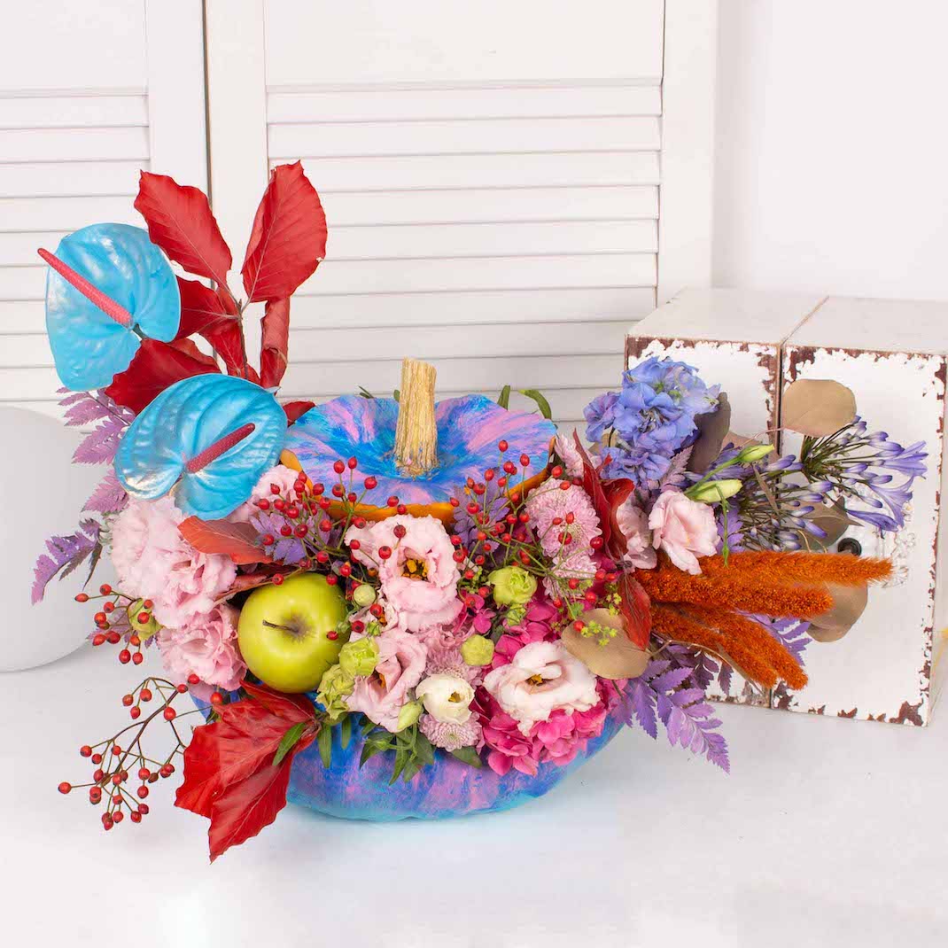 Aranjament in bostan cu mar, 3 lisianthus roz, hortensia roz, delphinium, 2 agapanthus, 2 crizanteme santini roz, verdeata si alte flori de decor.