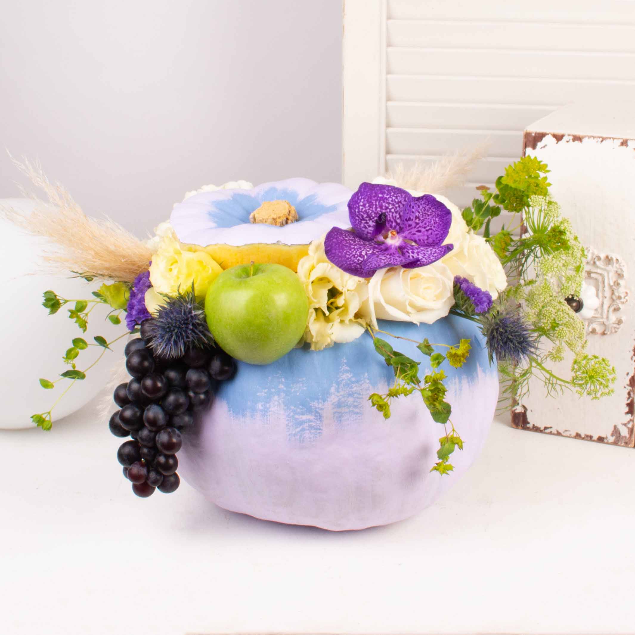 Aranjament in bostan lila-albastru cu mar, struguri, hortensia alba, 3 trandafiri albi, lisianthus alb, verdeata si alte flori de decor.